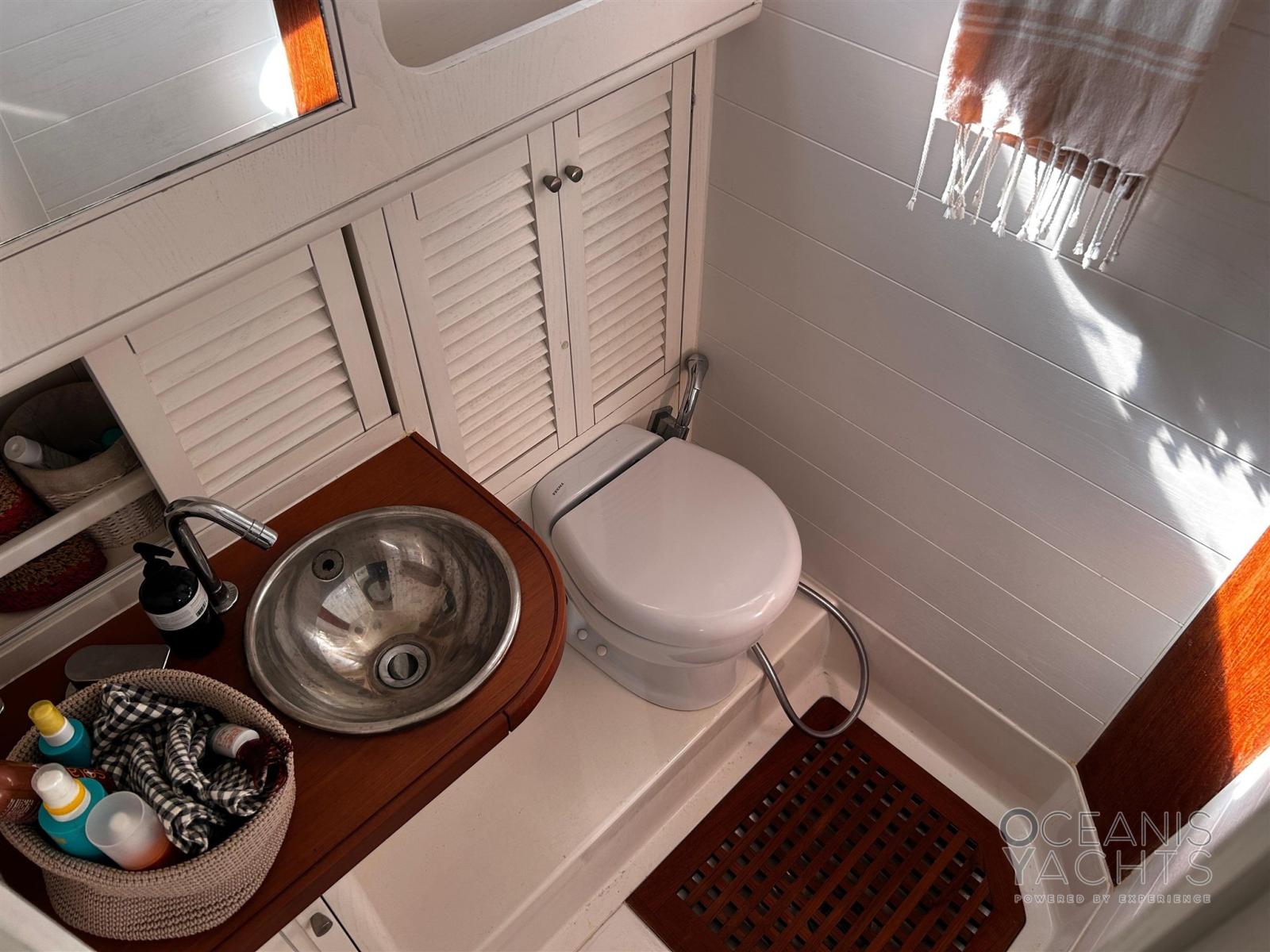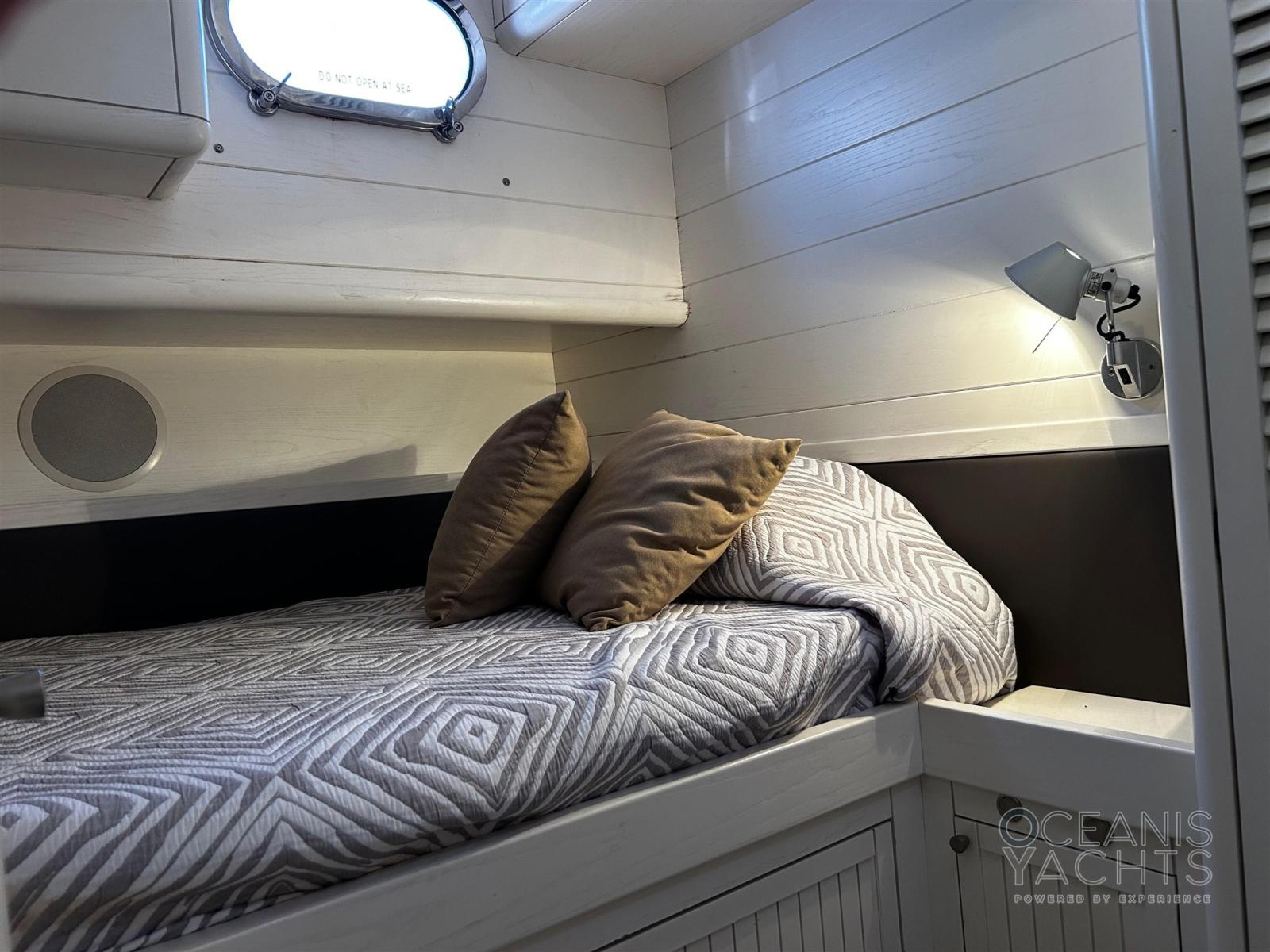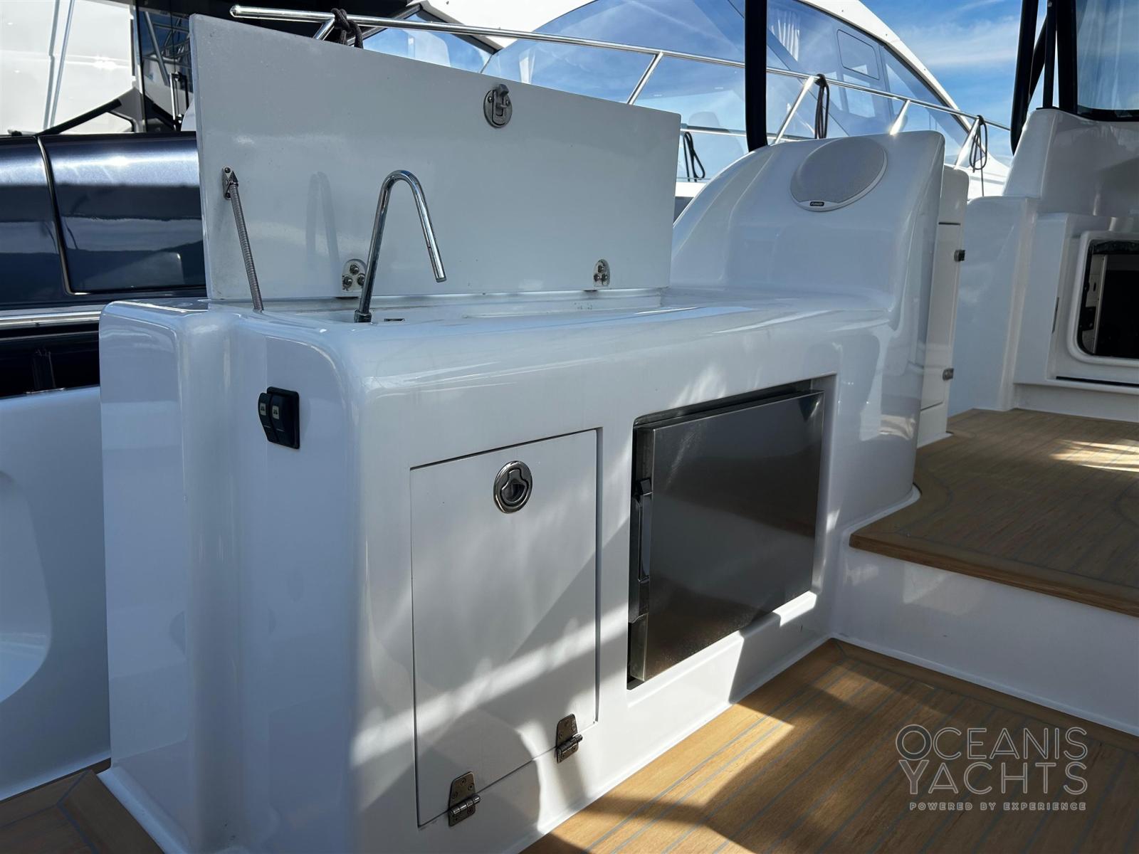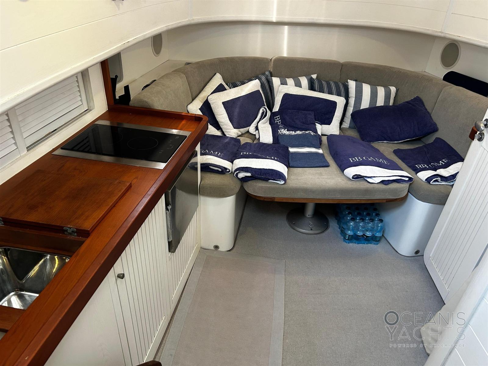 BBQ/ Grill, Clima reversibile, Indicatore del serbatoio del carburante, Indicatore del Serbatoio dell’Acqua, Indicatore della temperatura del motore, Pavimento interno in legno, Prese interne 12v, Prese interne 220v, WC marino elettrico.