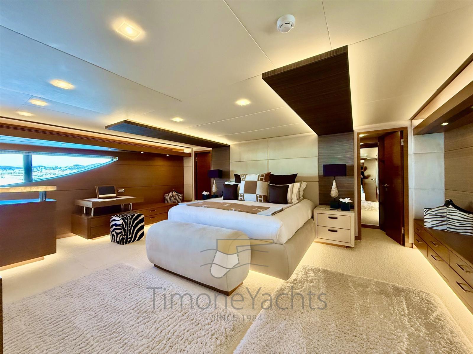 Arricchiti da motivi zebra e imbottitura Hermès ovunque, gli interni di questo yacht sono più che generosi. La disposizione a tre piani offre molti spazi abitativi, tra cui uno skylounge intimo e un confortevole salone principale, dotato di lucernario.
