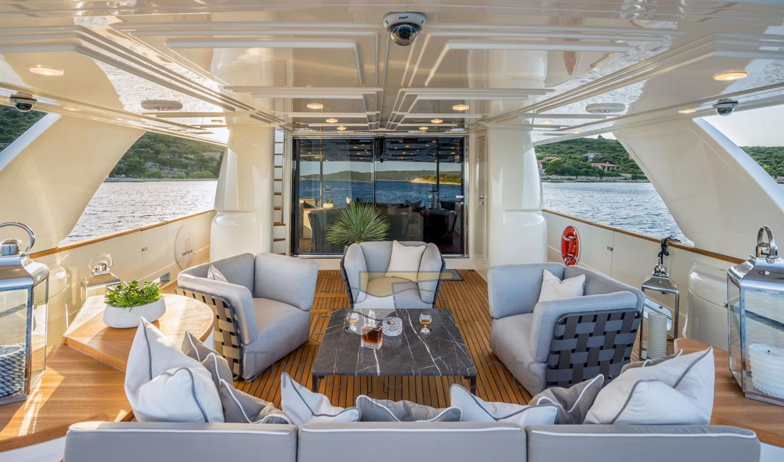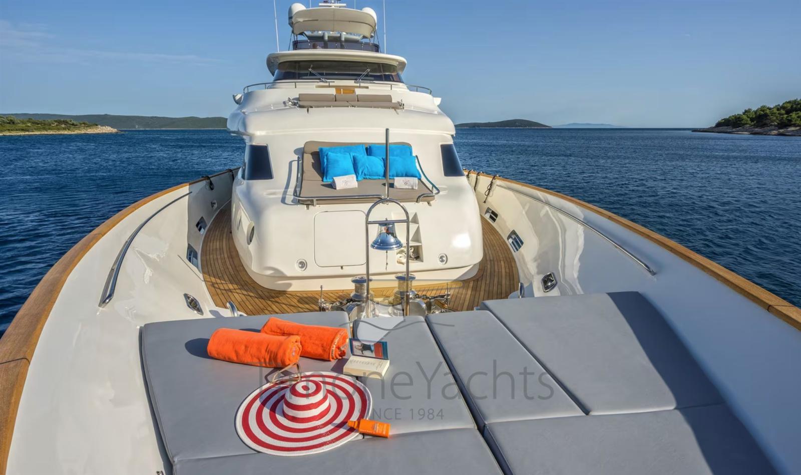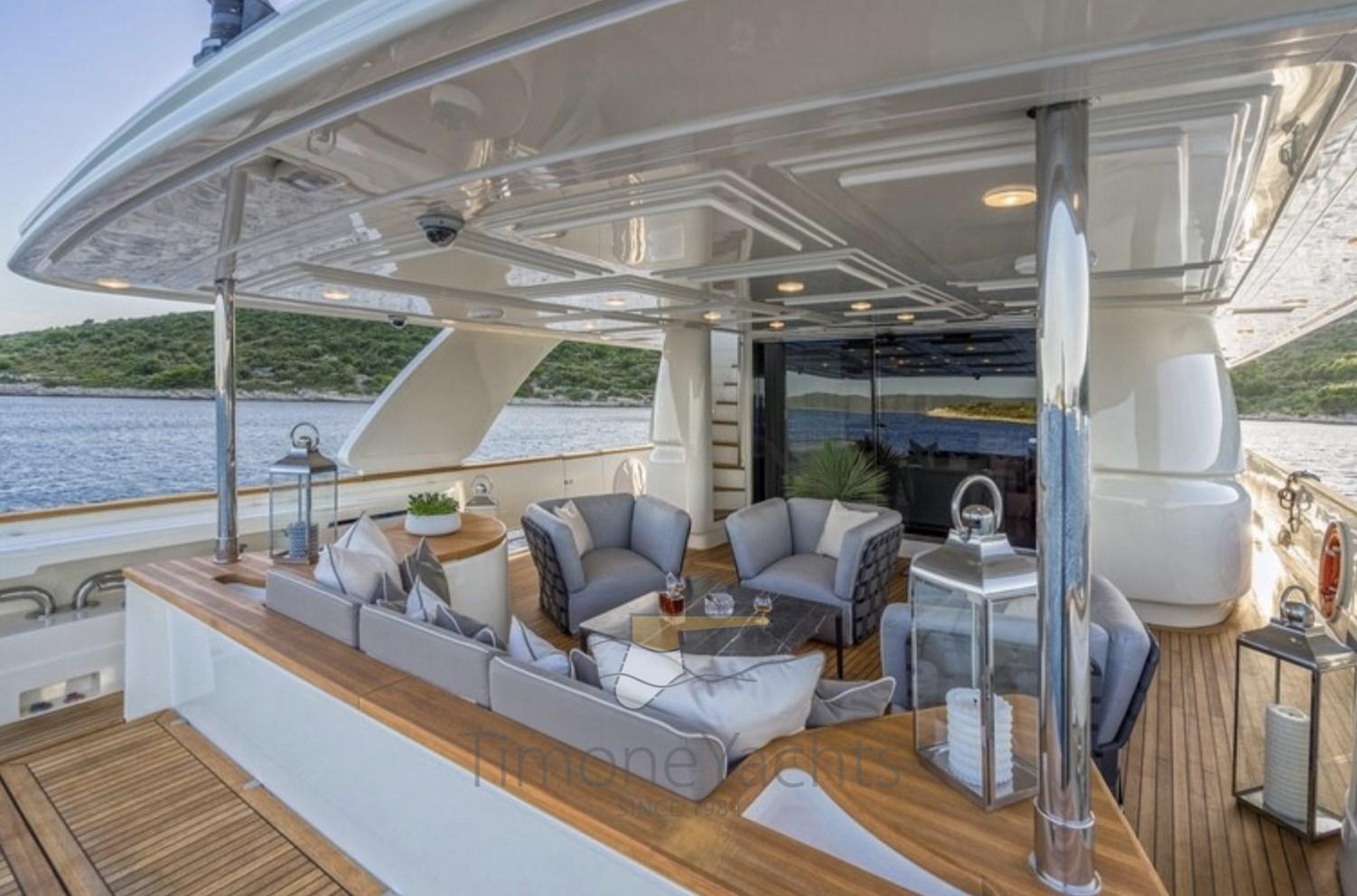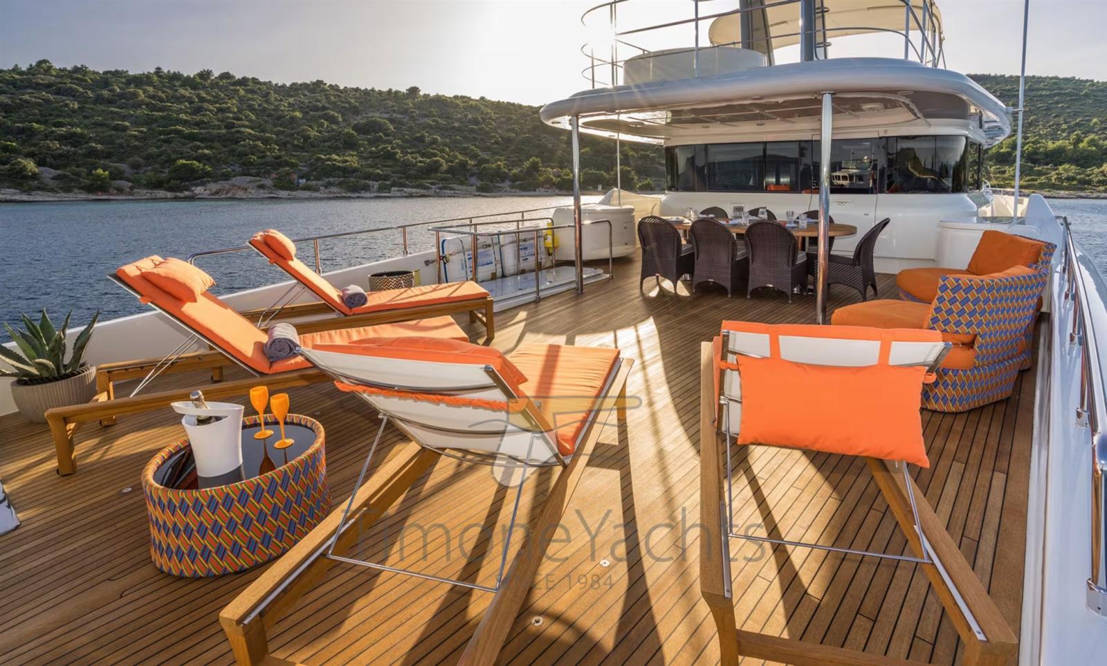 Camminamenti laterali in teak, Doccia esterna, Fari fissi a poppa, Faro orientabile, Garage per tender, Gruette per tender su fly, 2 Lavaggio catena, Luci di cortesia, Passerella, Ponte in teak, 3 Porta laterale, Pozzetto Teak, Presa 220V banchina, Stabilizzatori (zero speed + underway), Tavolo pozzetto, Tender, Tromba, Winch tonneggio di poppa.