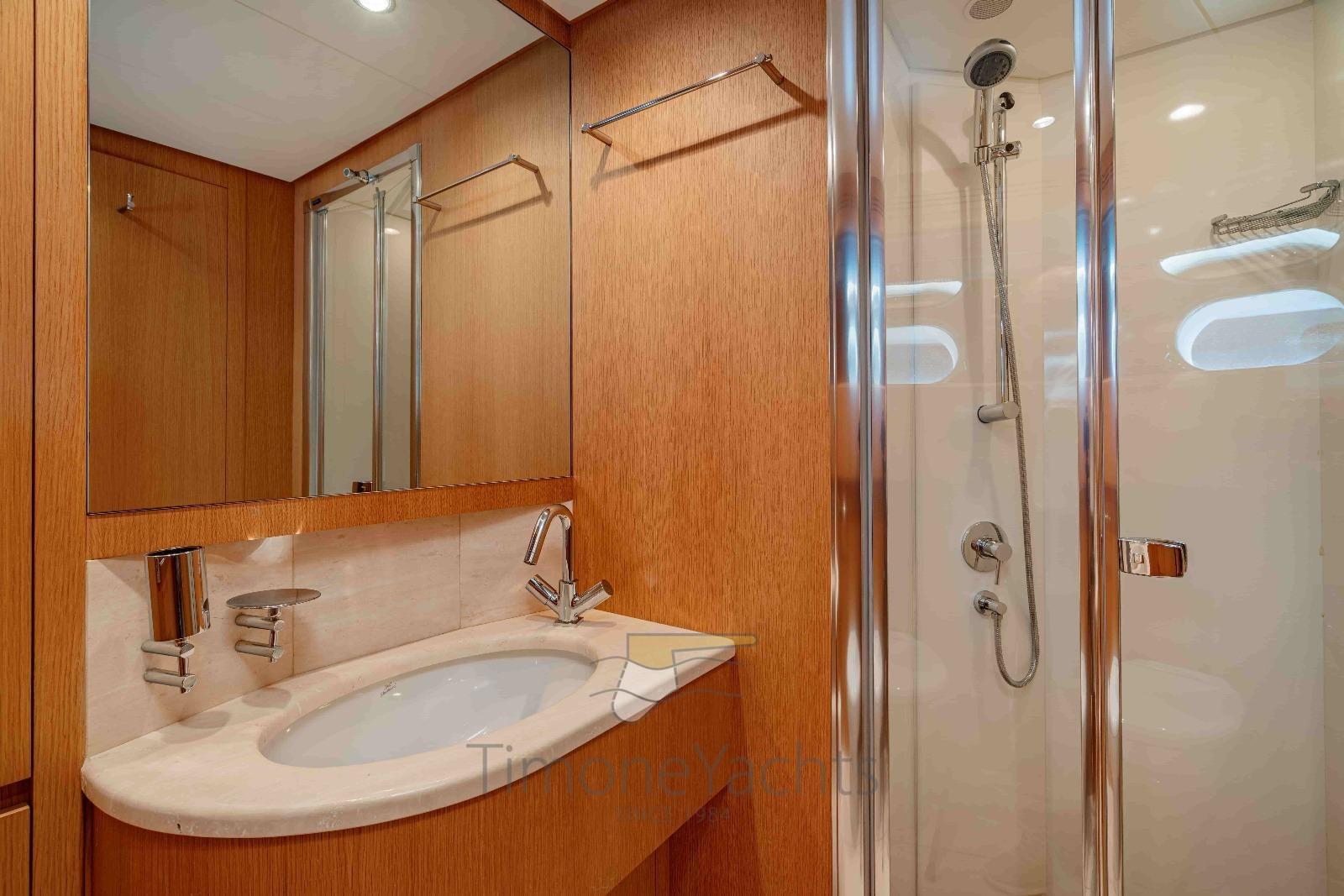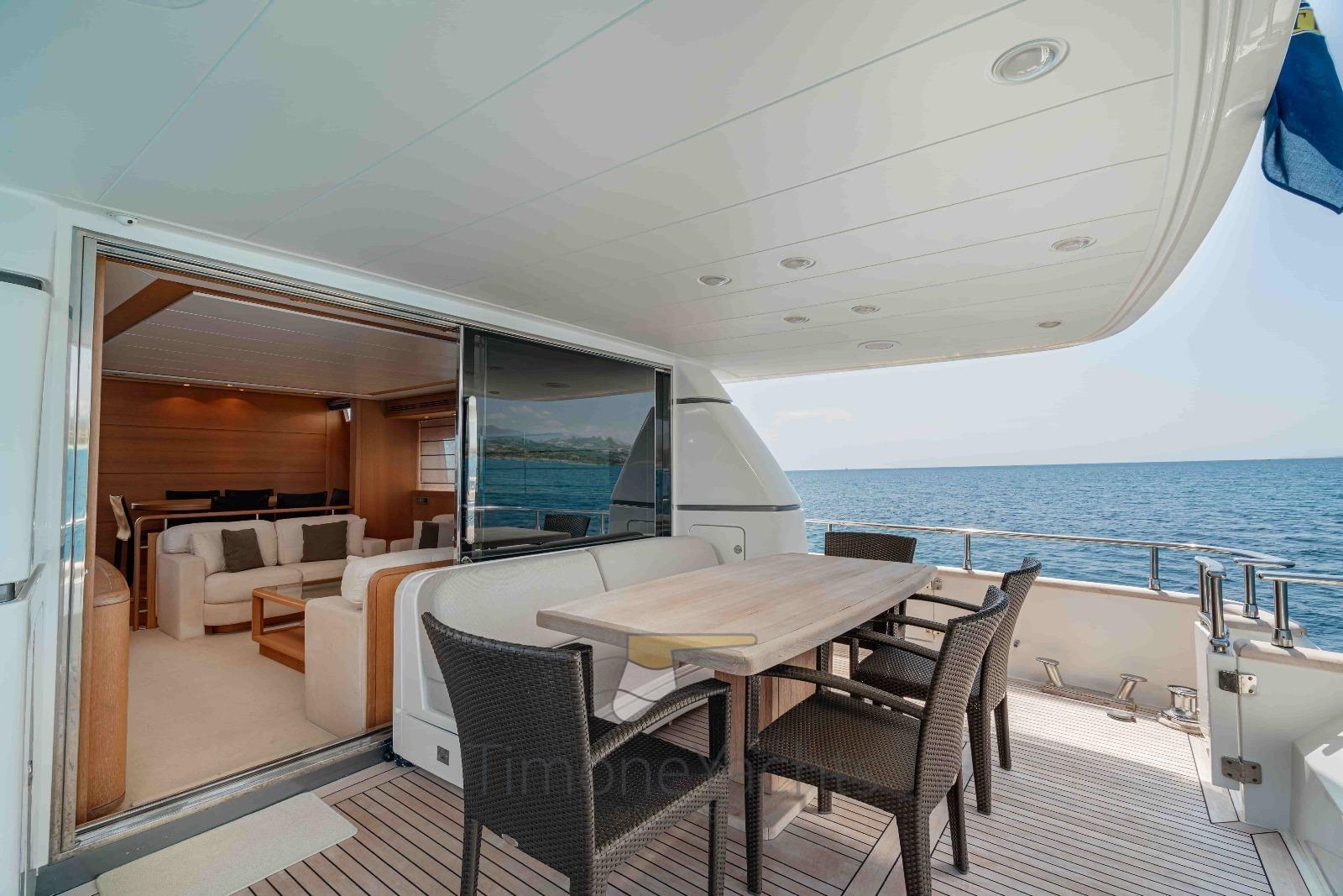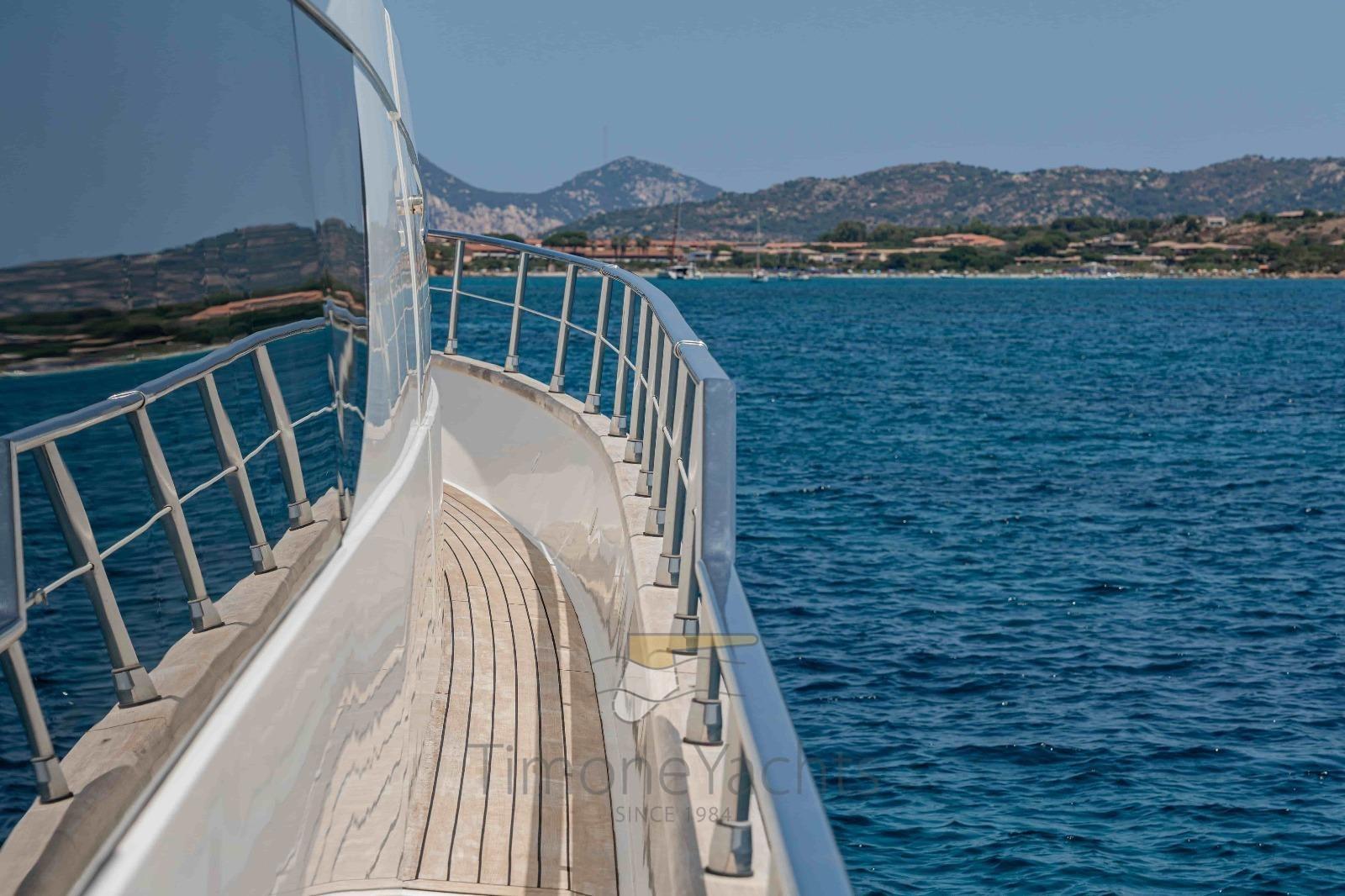 Allarme fumo/gas, Allarme motore, Allarme sentina, Alternatore, Autoclave, Camminamenti laterali in teak, Doccia esterna, Doppia timoneria, Flap idraulici, Gruette per tender su fly, Lavaggio catena, Luci di cortesia, Passerella, Piattaforma, Pompa di sentina automatica, Ponte in teak, Porta ingresso, Porta laterale, Pozzetto Teak, Presa 220V banchina, Presa acqua banchina, Raddrizzatore, Salpa Ancore Elettrico, Scaletta da bagno, Selle per Tender, Tavolo pozzetto, Tender (Williams Diesel Jet 565), Tientibene con cancelletti, Tromba, Winch tonneggio di poppa, Winch tonneggio di prua.