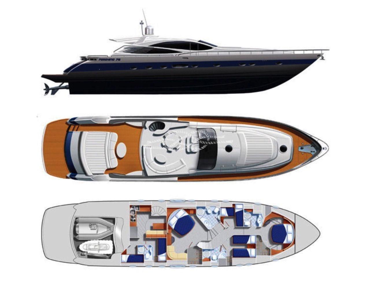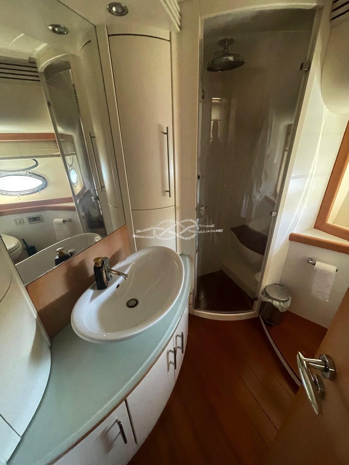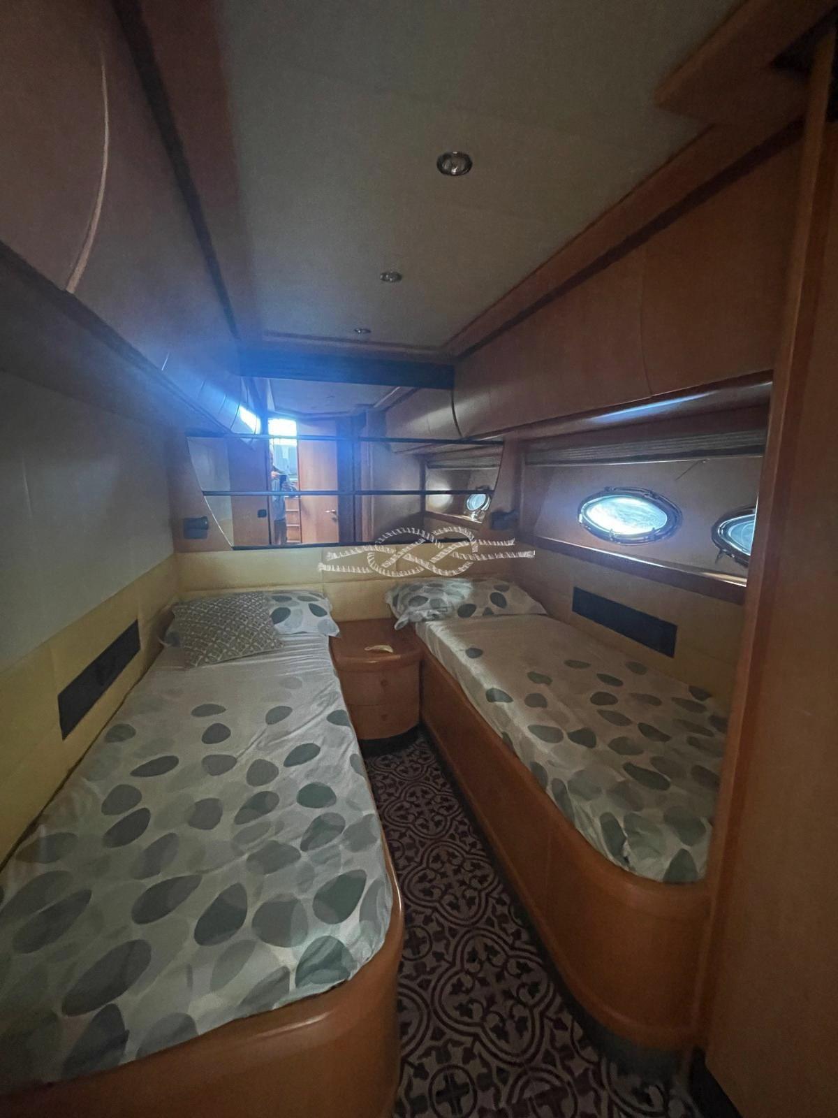 Cabina armatoriale con letto matrimoniale, cabina armadio e bagno - cabina Vip con letto matrimoniale e bagno - cabina ospiti con due letti in piano - cabina ospiti con due letti incrociati - bagno ospiti.
