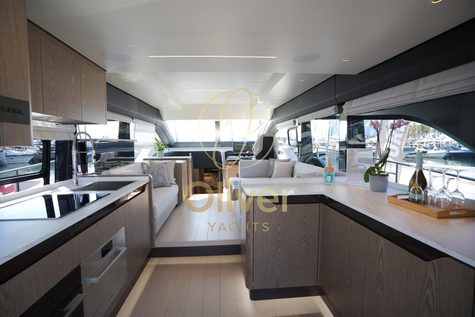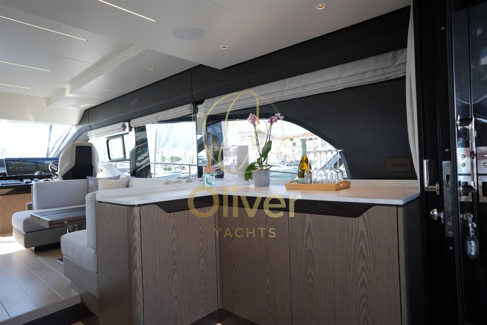 Gli interni del Sessa Marine F60 rappresentano la perfetta sintesi tra eleganza contemporanea, funzionalità e comfort. Il layout del Main Deck si distingue per la disposizione conviviale del salone, dove la cucina open-space si integra con l’area living, illuminata da ampie vetrate panoramiche che garantiscono una vista continua sul mare. L’atmosfera è sofisticata ma accogliente, valorizzata da materiali di alta gamma, essenze naturali e dettagli curati secondo la migliore tradizione artigianale italiana.