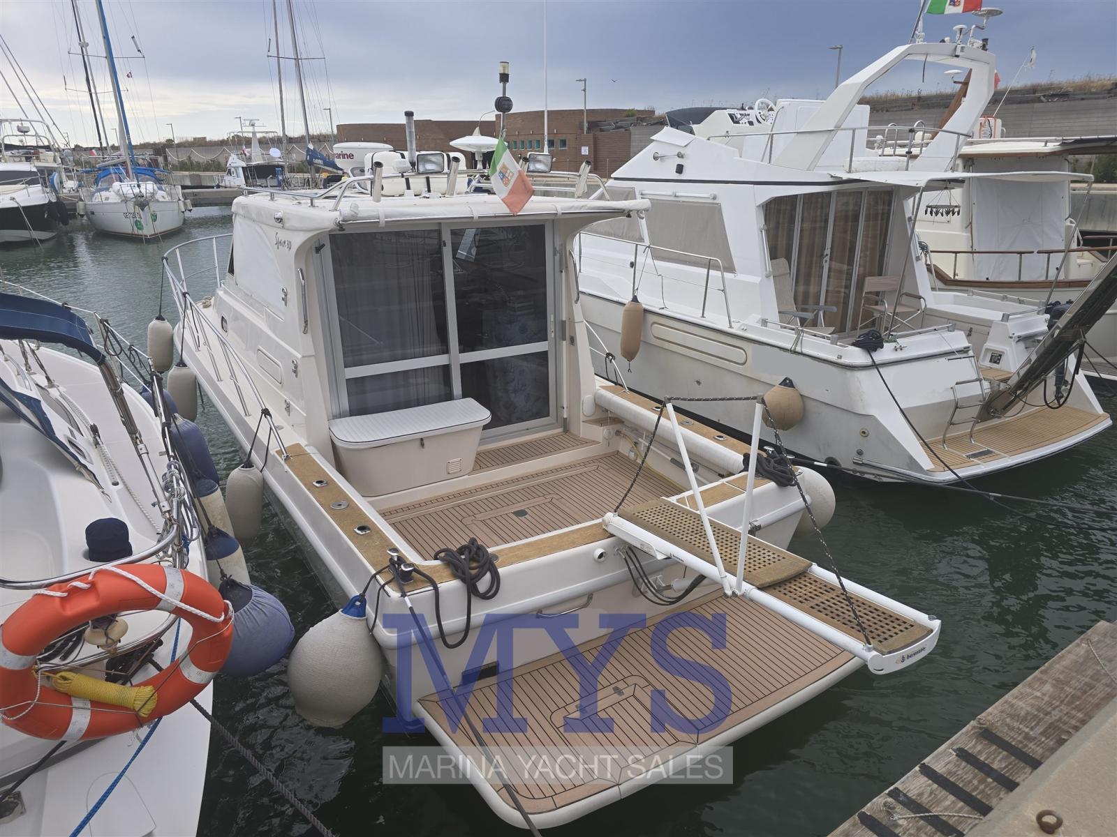Allarme motore, Allarme sentina, Autoclave, Doccia esterna, Fari fissi a poppa, Flap idraulici, Piattaforma, Pompa di sentina automatica, Porta ingresso, Pozzetto Teak, Salpa Ancore Elettrico, Scaletta da bagno, Tromba.