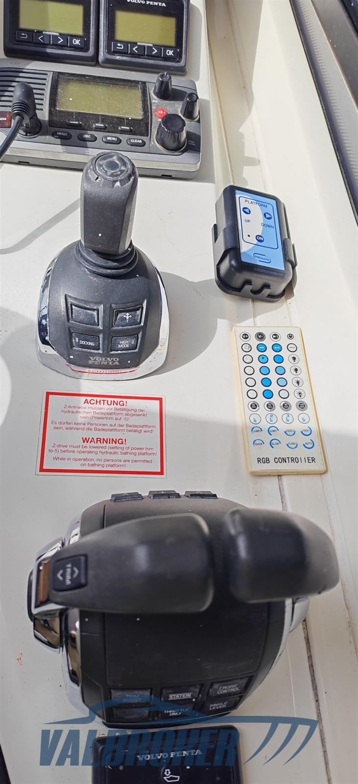 Bussola (Plastimo), Comando motori elettronico (Volvo), Computer di bordo, Ecoscandaglio (Garmin), GPS (Garmin), Joystick (Volvo Penta), Pilota automatico (Garmin GHC 10), Radio VHF (Garmin).