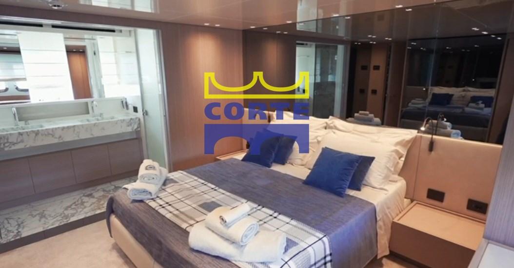 Cabina armatoriale matrimoniale con TV da 50'' dietro allo specchio, oscuranti per gli oblo della camera e del bagno. Bagno armatore.