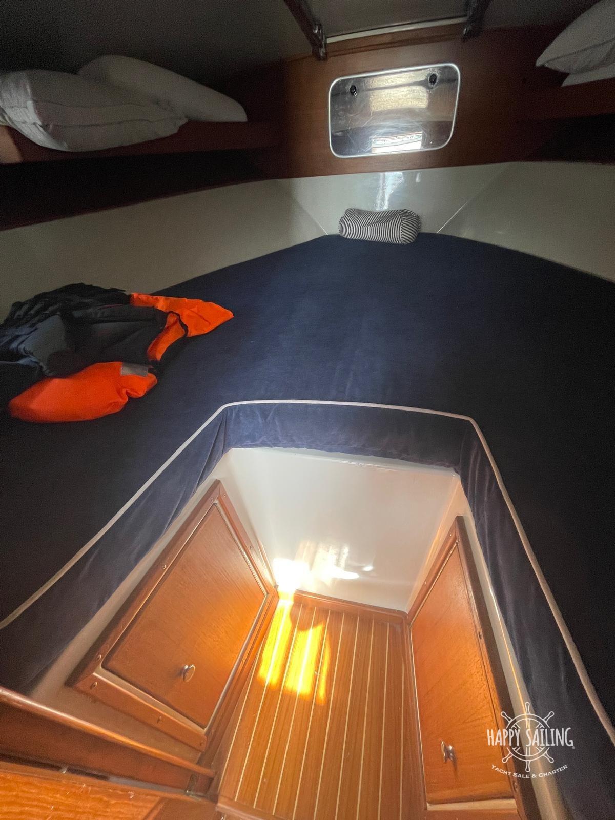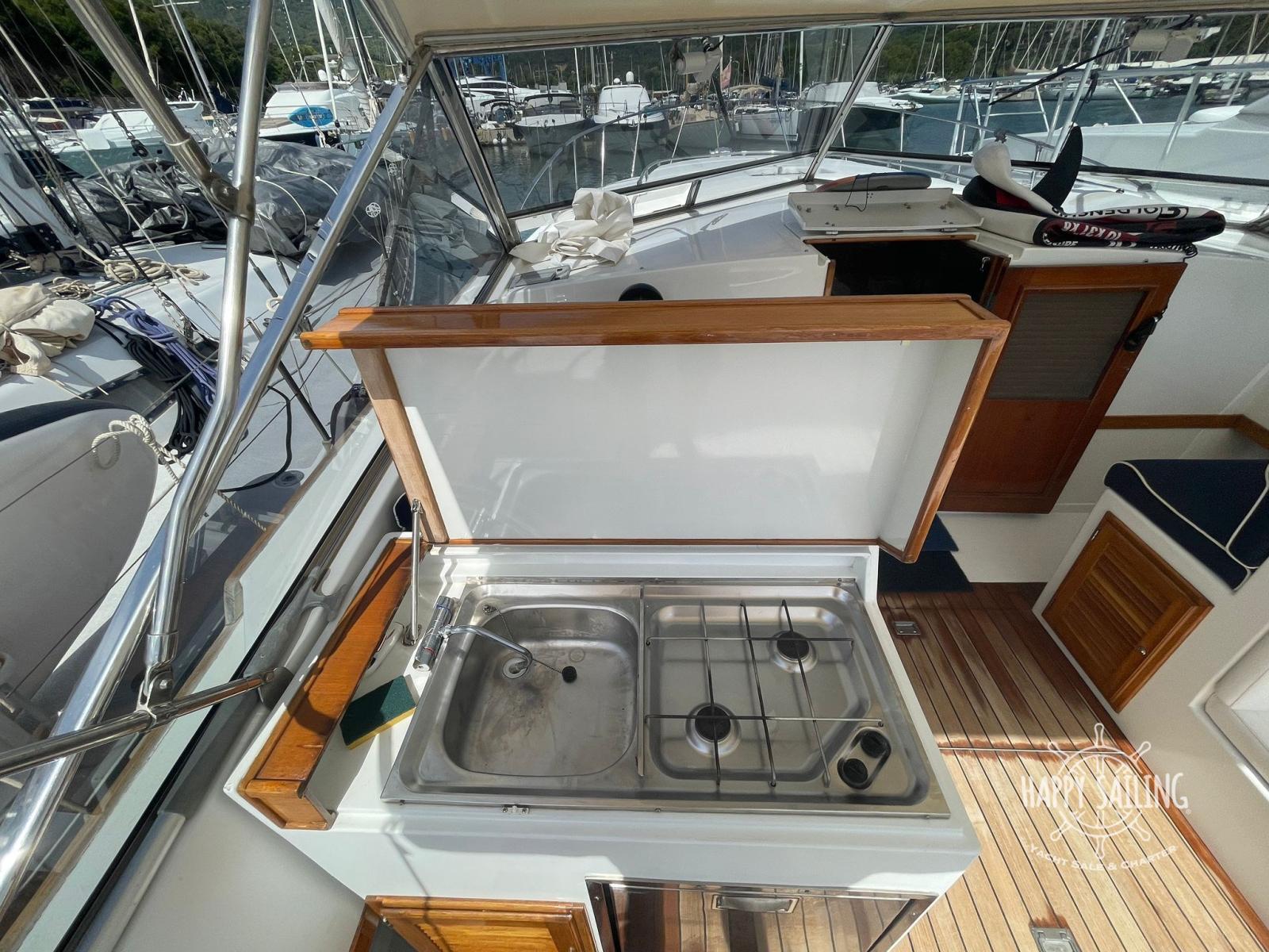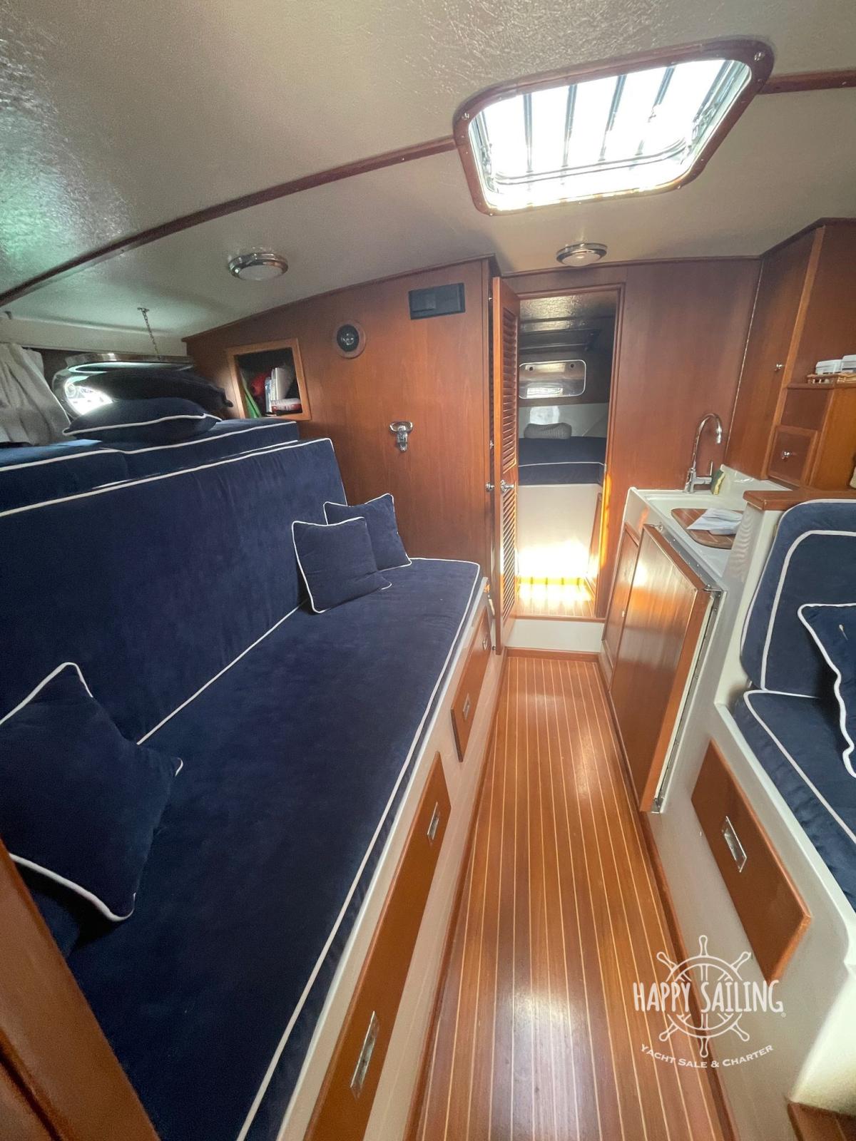Entrando in barca è presente, sulla sinistra, il bagno con oblò completo di lavandino, wc elettrico e doccia. Più avanti, nella dinette, è presente sulla destra un divano doppio con tavolo da pranzo in legno e sulla sinistra un divano lungo utilizzabile come letto