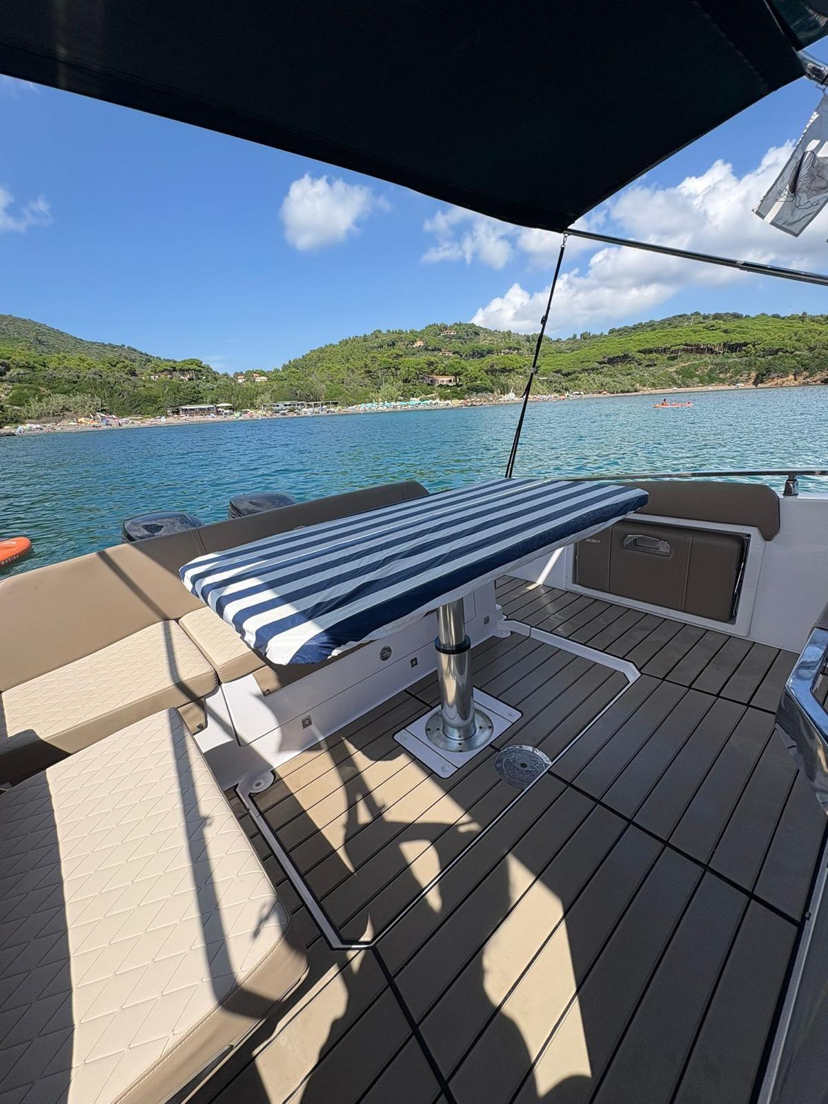 Flap elettrici (con joystick), Pozzetto Teak (Seadeck), Rollbar (con asta portabandiera), Salpa Ancore Elettrico, Tavolo pozzetto, Tromba (elettrica).