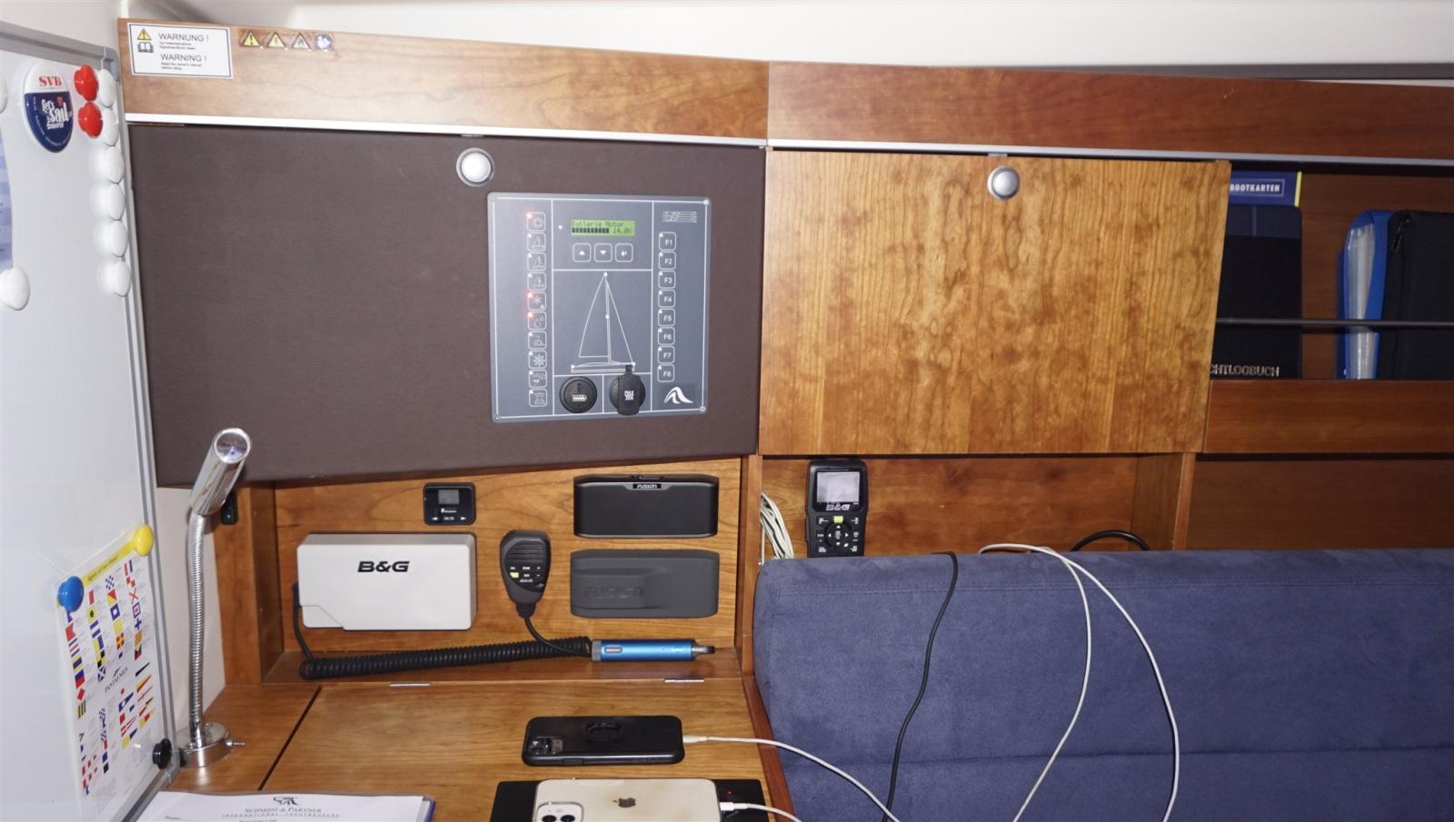 AIS, Angolo barra, Antenna radar (B&G Broadband), Contamiglia (B&G Triton), Ecoscandaglio (B&G Triton), GPS (B&G), Log (B&G Triton), Luci di navigazione (LED), Pilota automatico (B&G), Radar (B&G), Radio VHF (B&G + handheld B&G), Stazione vento (B&G Triton).