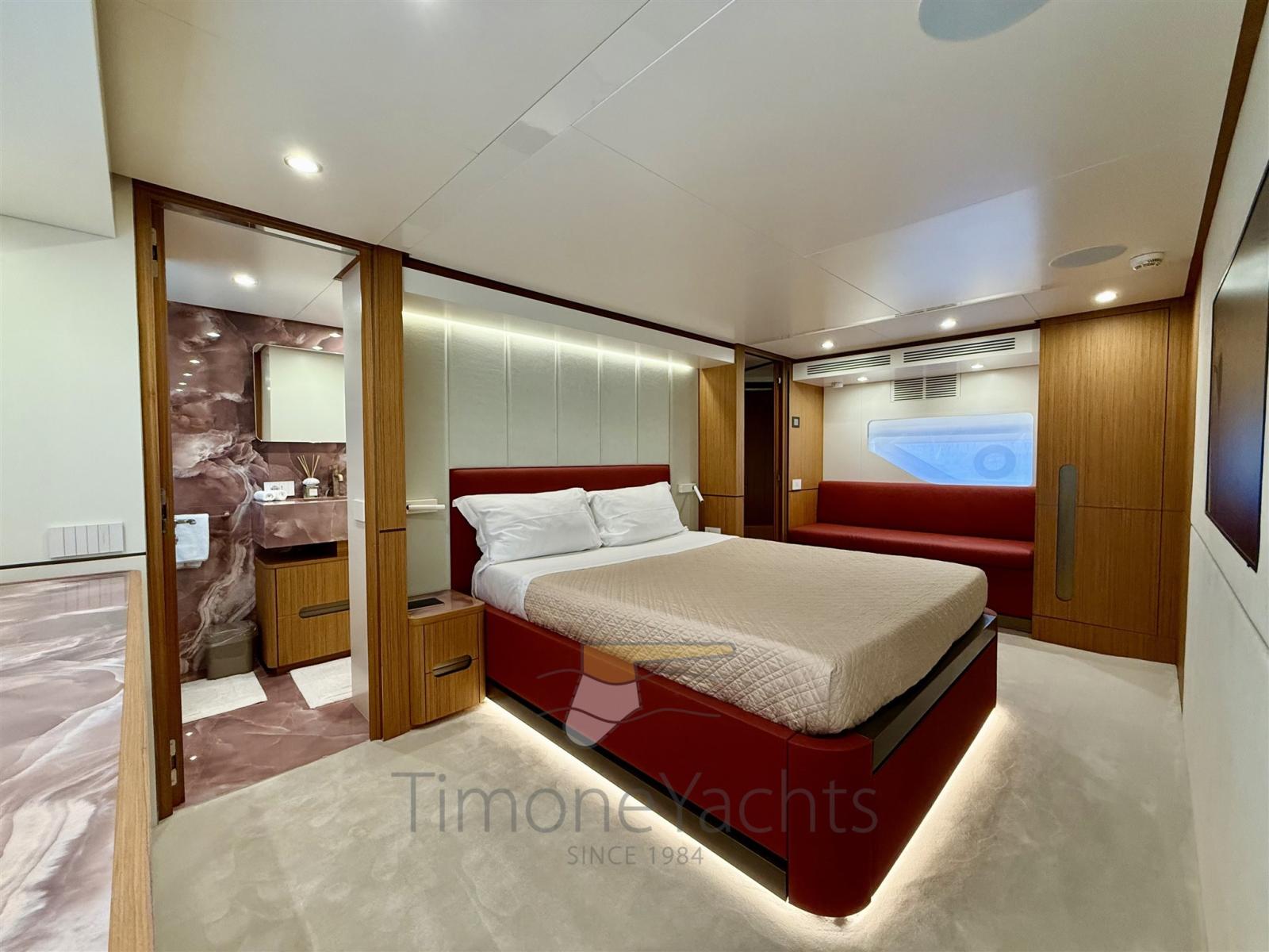 Tre stabilizzatori: giroscopio Seakeeper, pinne (in navigazione + zero speed), e il terzo? il terzo è nella cabina armatoriale dove, ebbene sì, anche il letto armatoriale è stabilizzato antirollio.