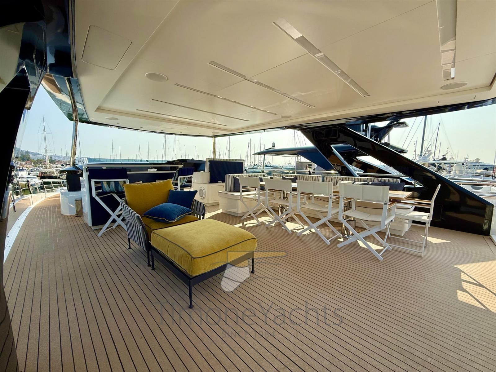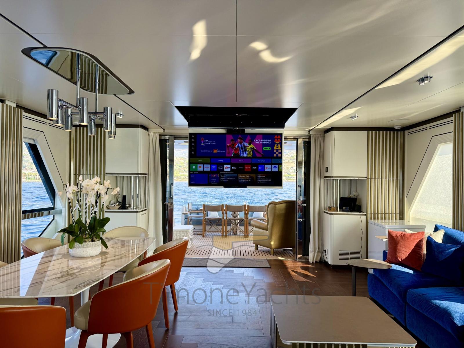 Una velocità di crociera continuativa di 18/19 nodi e una massimo di 25 nodi ti porteranno senza sforzo in tutto il Mediterraneo. La navigazione fluida da un flybridge straordinario, un unico ponte che si sviluppa tutto intorno al nucleo sociale dell'unità. Le zone pranzo, le aree prendisole, l'unità bar e i lussuosi mobili da esterno fluiscono insieme come raro trovare su uno yacht di queste dimensioni.