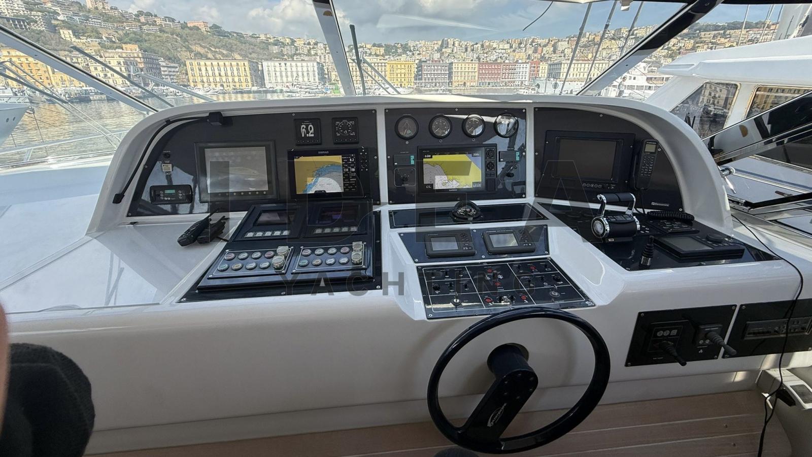 Antenna radar, Comando motori elettronico (MTU), Ecoscandaglio (Garmin), GPS (Garmin), Pilota automatico (Simrad), Plotter con antenna GPS (Garmin), Radio VHF (Furuno), Stazione vento (Garmin).
