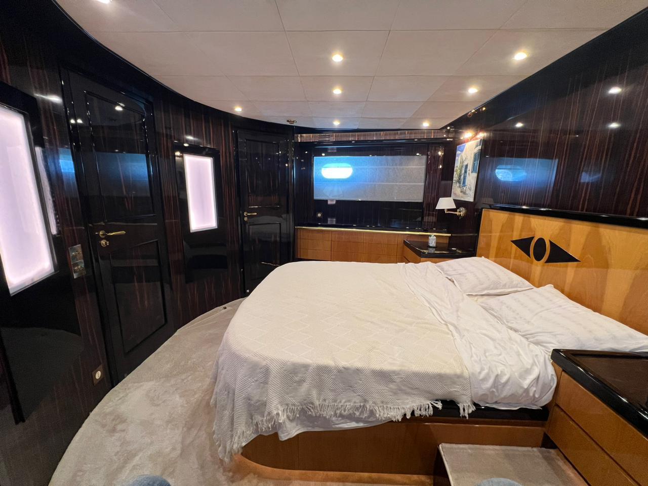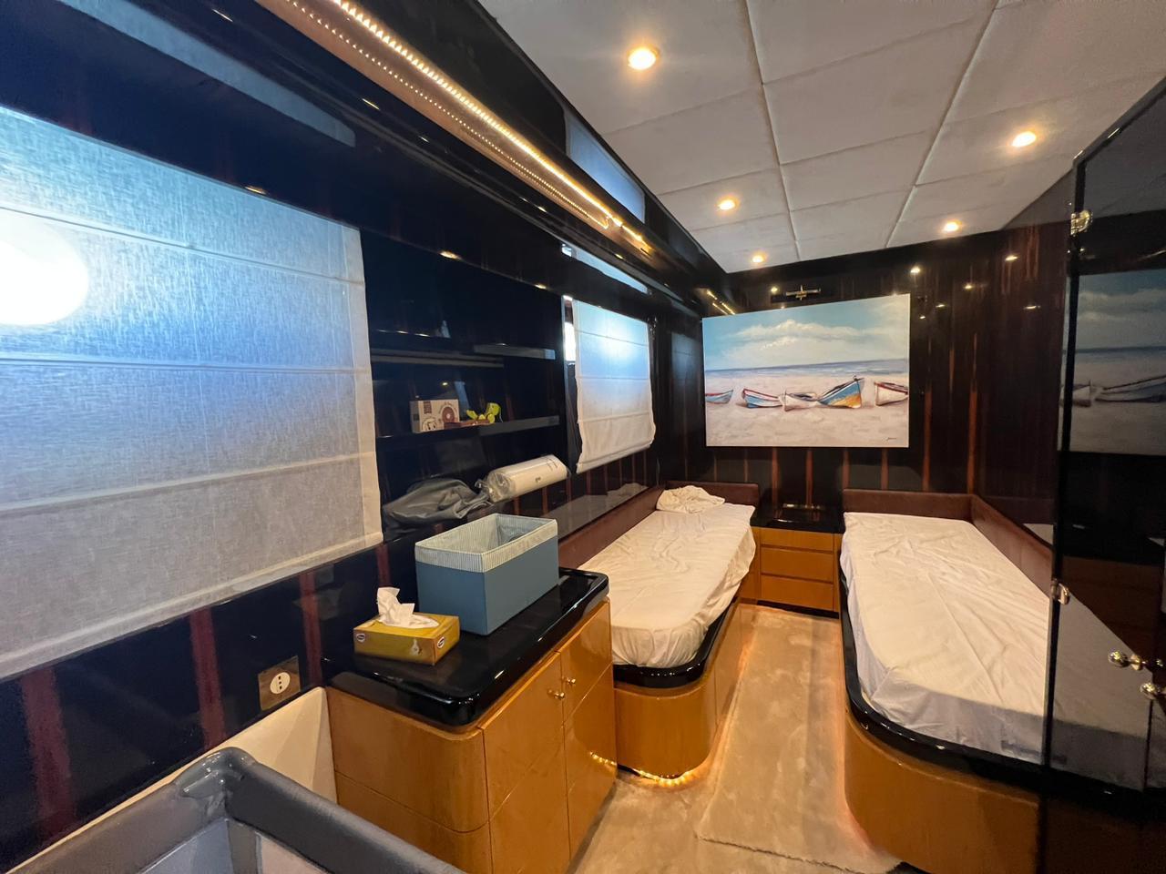 She can accommodate up to 6 guests in 3 staterooms, with 3 crew members waiting on their every need. Her outdoor deck features an al fresco dining area next to the main saloon, a small galley with a fridge, barbecue and wash basin; and an additional large seating area that also doubles as a solarium. On the bow is a large solarium that hides below it a big Jacuzzi for 4 persons. A large Bikini tent covers the entire area.
