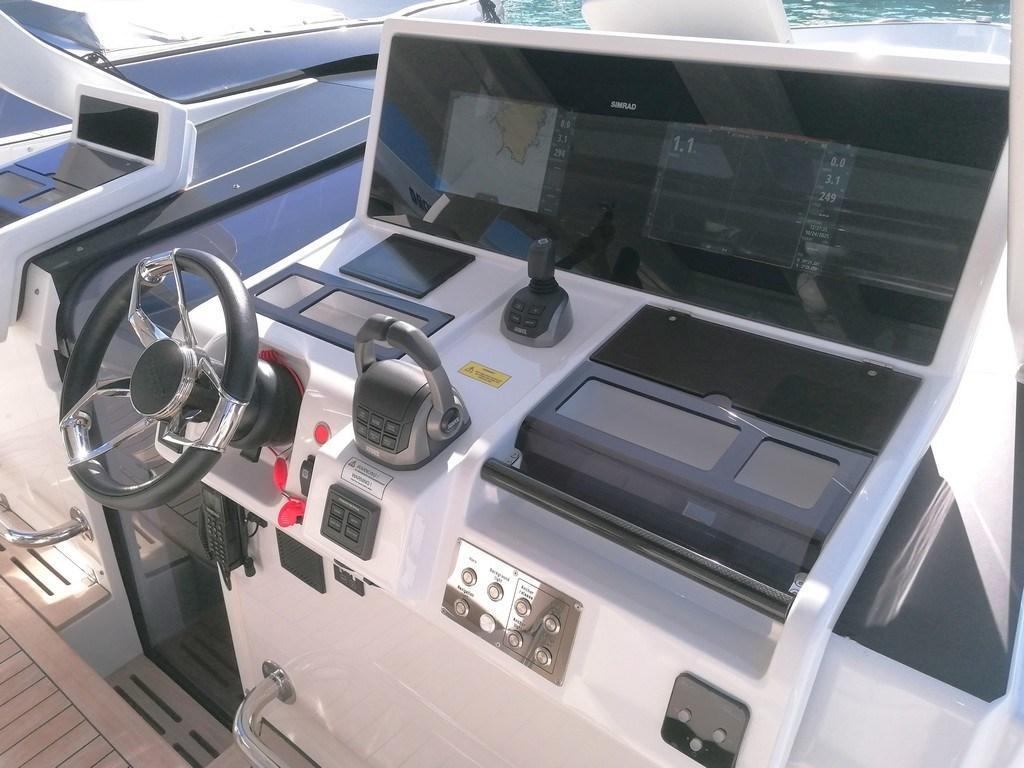 AIS ((option) Simrad NAIS500), Angolo barra, 2 Comando motori elettronico (Volvo 2,5" engine + EVC), Contametri catena ((option) Quick), Display (Volvo multifunction 7" display), DSC vhf (Simrad VHF RS100, with VHF antenna and splitter for FM/AIS), Joystick (Volvo), Pilota automatico ((option) Simrad with electronic compass), Plotter (Simrad multifunction display NSS evo3-12" at dashboard with DST transducer), Radar ((option) Simrad HALO20+), Sonar (Simrad Sonarhub Sounder).