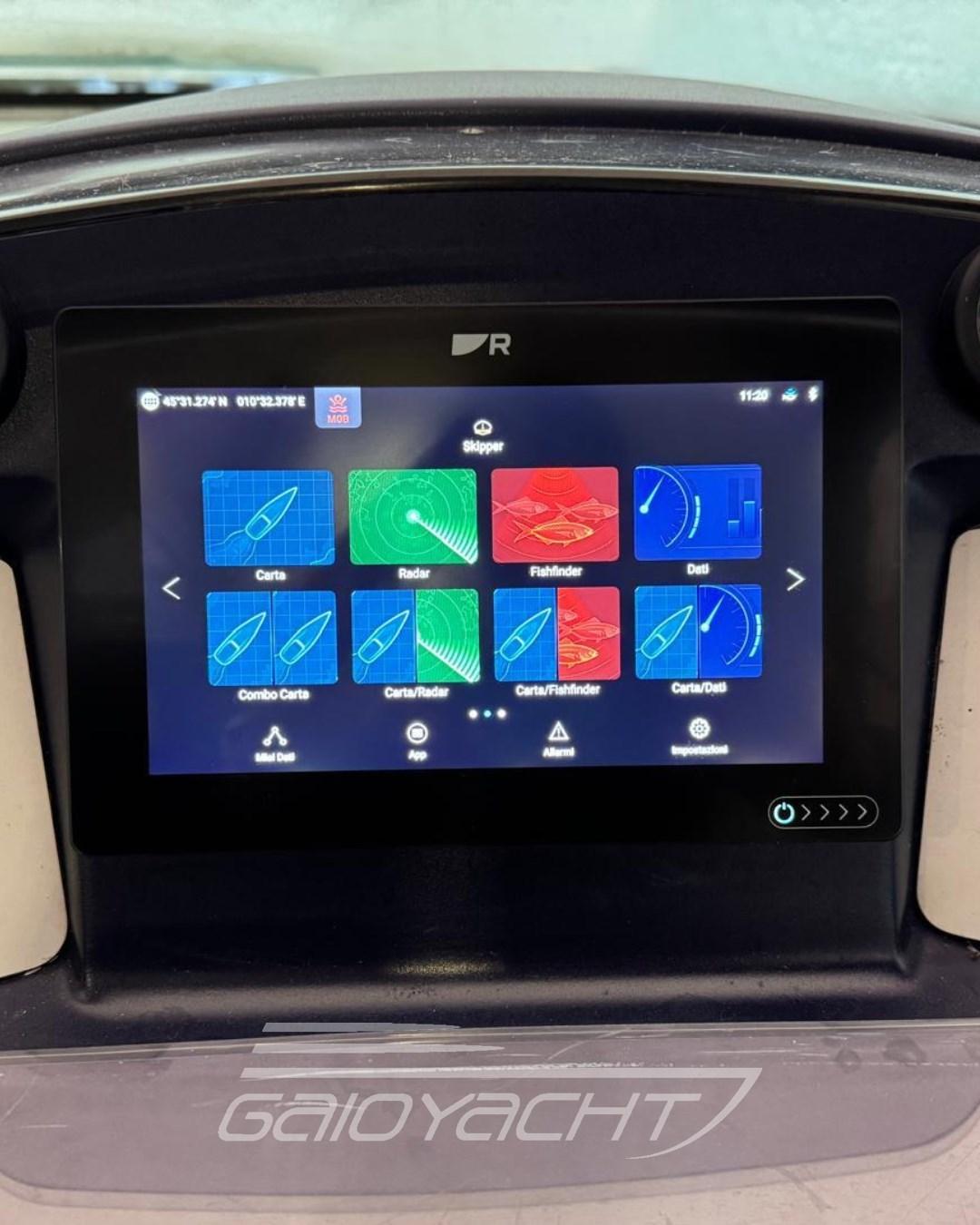 Estintore; salpa ancora di prua; fanale di navigazione; impianto d'acqua calda; strumento di velocità; lavello; telo completo e telo copertura invernale in PVC nel 2023; plancetta di poppa integrata; doccia di coperta; connettore Bluetooth; bar con lavello; manette elettriche; strumentazione Volvo Penta; sostituzione faretti - tutti a led nel 2022; tappzzeria completa in ottimo stato; plancetta bagno allungata a 160cm nel 2024; impianto Fusion con 6 casse e 1 subwoofer nel 2023;