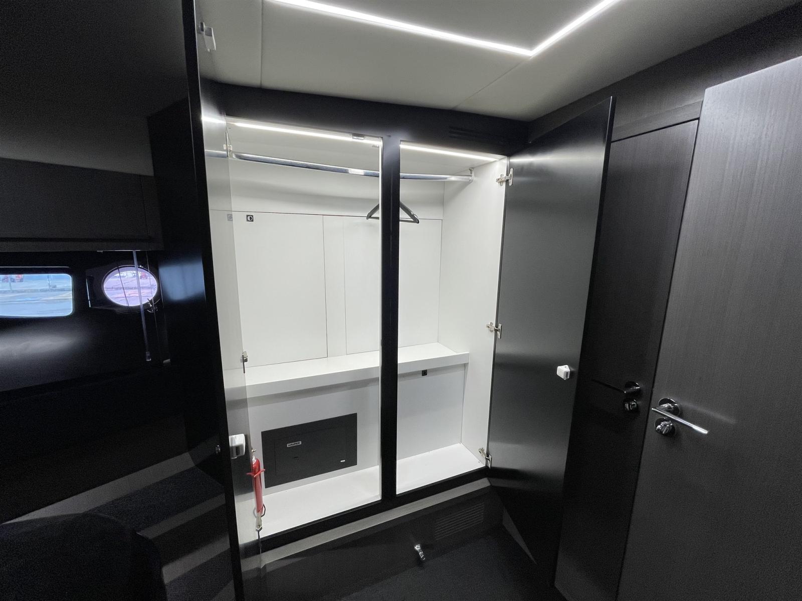 Acqua Calda, Aria condizionata (24.000 btu), Boiler, Cassaforte, Clima reversibile, Collegamento internet, Collegamento internet satellitare, Dissalatore, Impianto acque nere, Inverter (800 watt), Prese interne 12v, Prese interne 220v, Serbatoio Acque Nere, Telecamera (Sala macchine), WC marino elettrico.