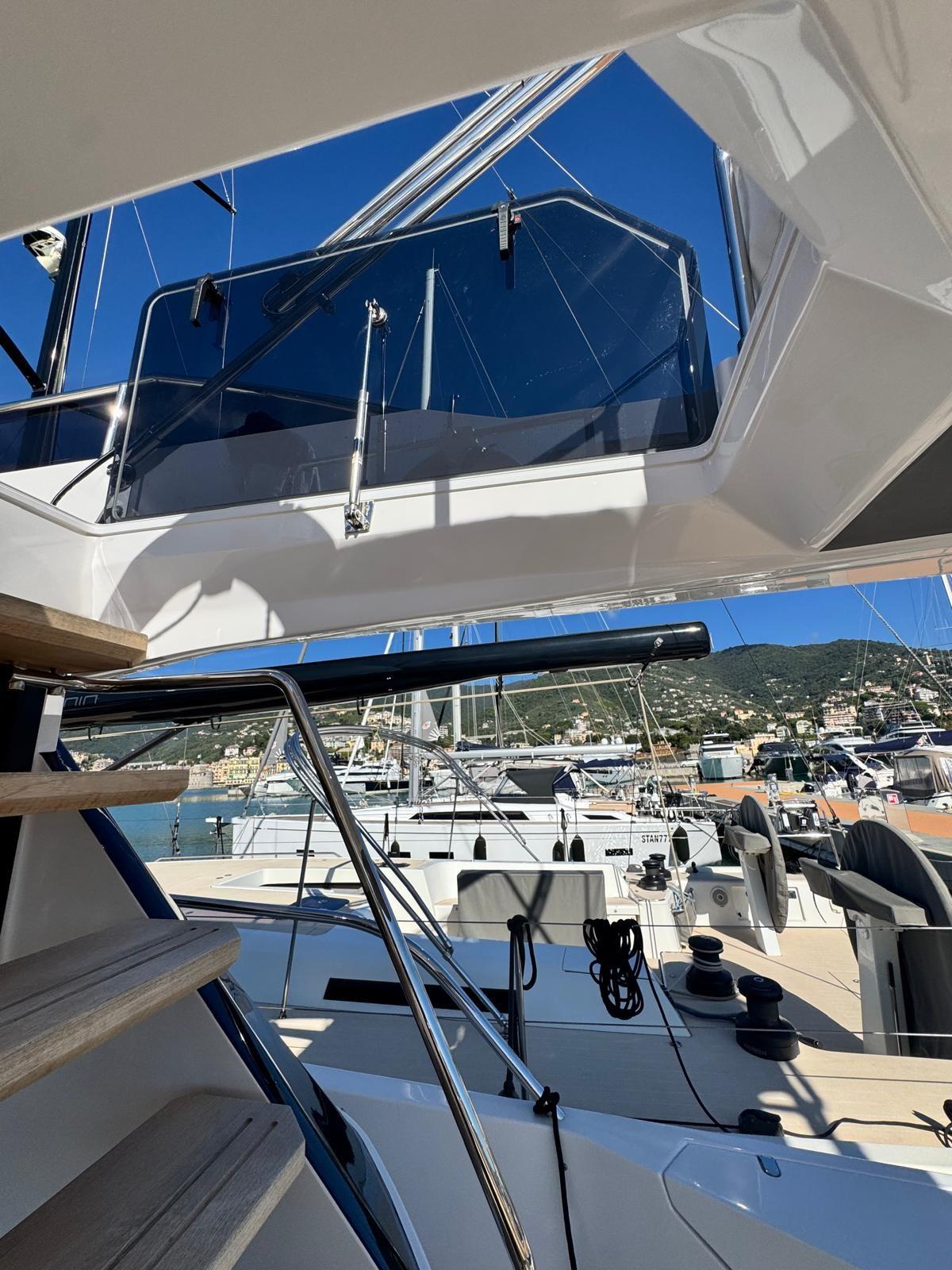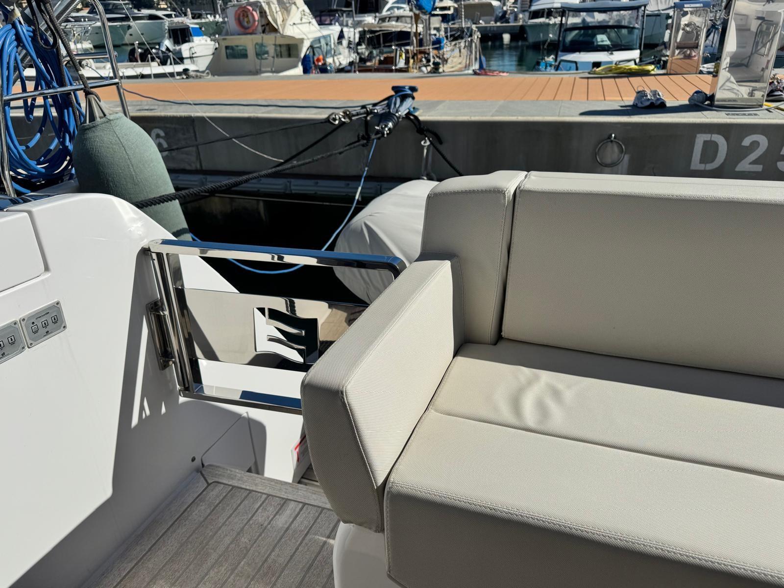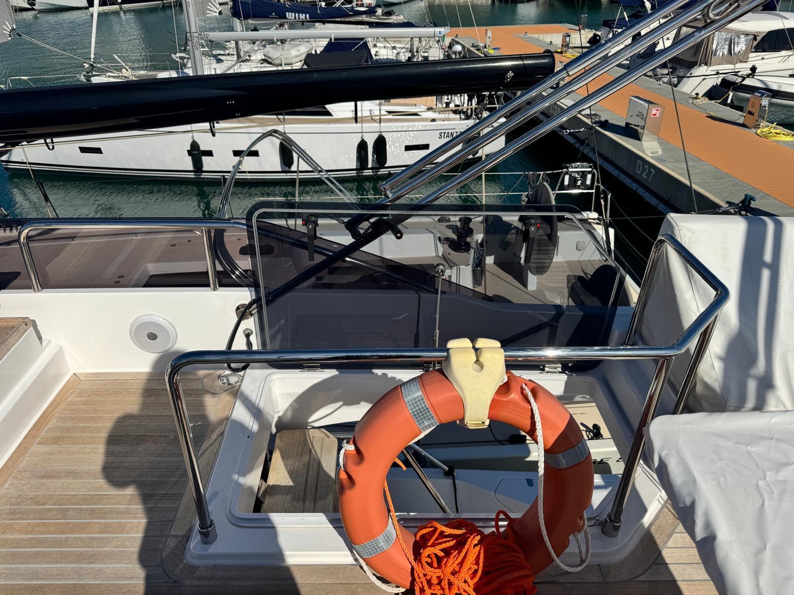 Allarme fumo/gas, Allarme sentina, Ancora (30 kg), Autoclave, Cavo corrente di banchina, Doppia timoneria, Lavandino nel Pozzetto, Luci di cortesia, Passerella, Piattaforma (Con discesa a mare), 4 Pompa di sentina automatica, 4 Pompa di sentina elettrica, Porta ingresso, Pozzetto Teak, Presa 220V banchina, Salpa Ancore Elettrico, Scaletta da bagno, Selle per Tender, Tavolo pozzetto (Telescopico), Tavolo Salone Abbattibile, Tender, Tientibene con cancelletti, Tromba, 2 Winch Elettrico (Poppa dx e sx).