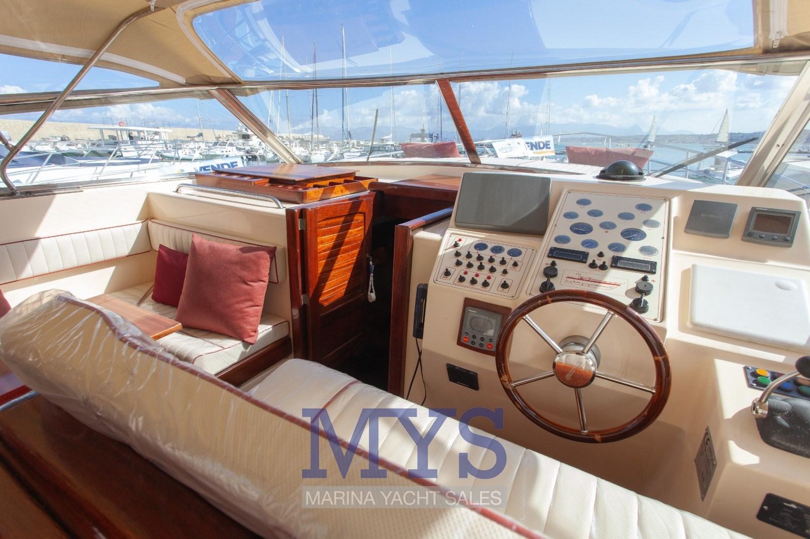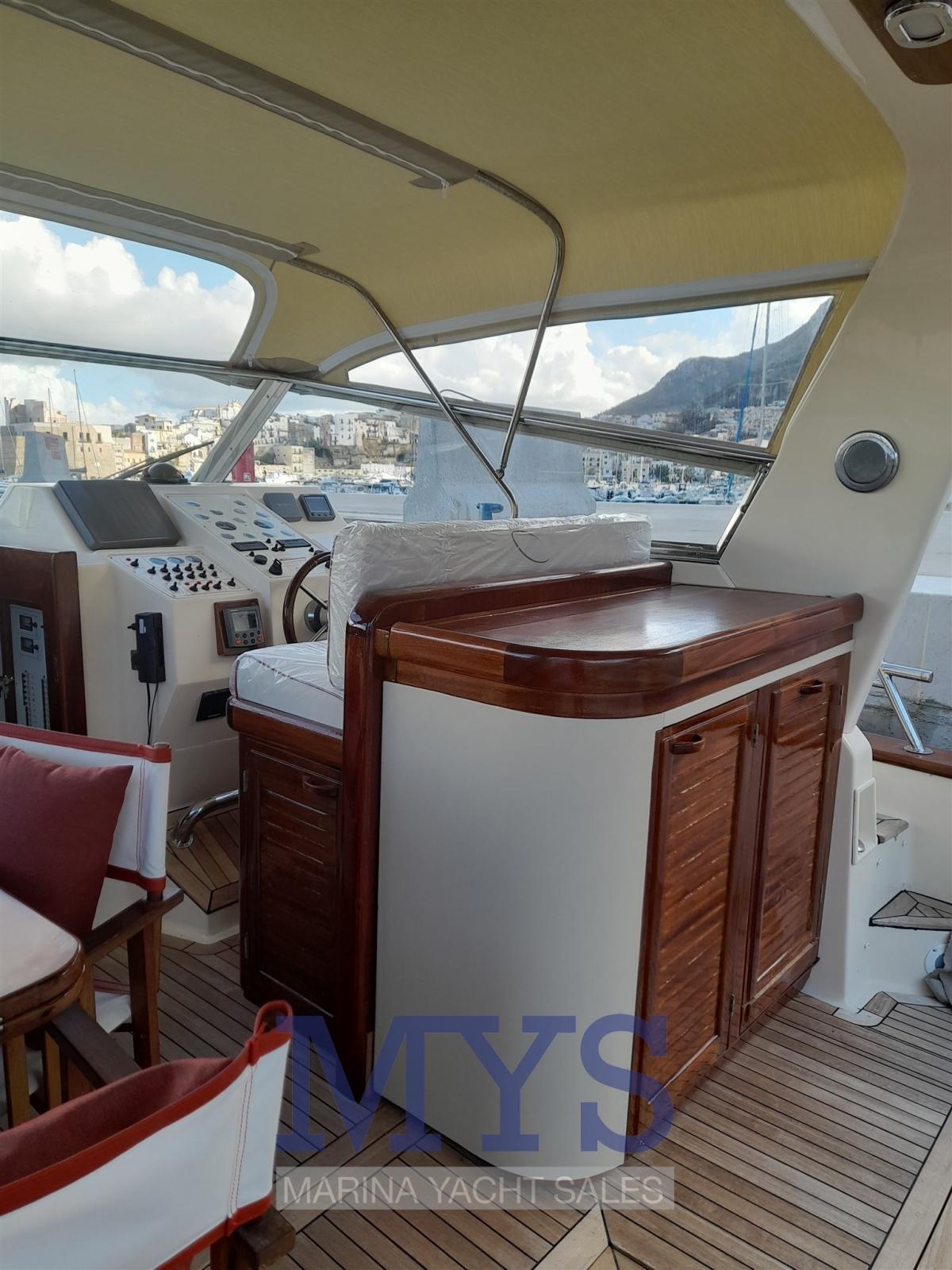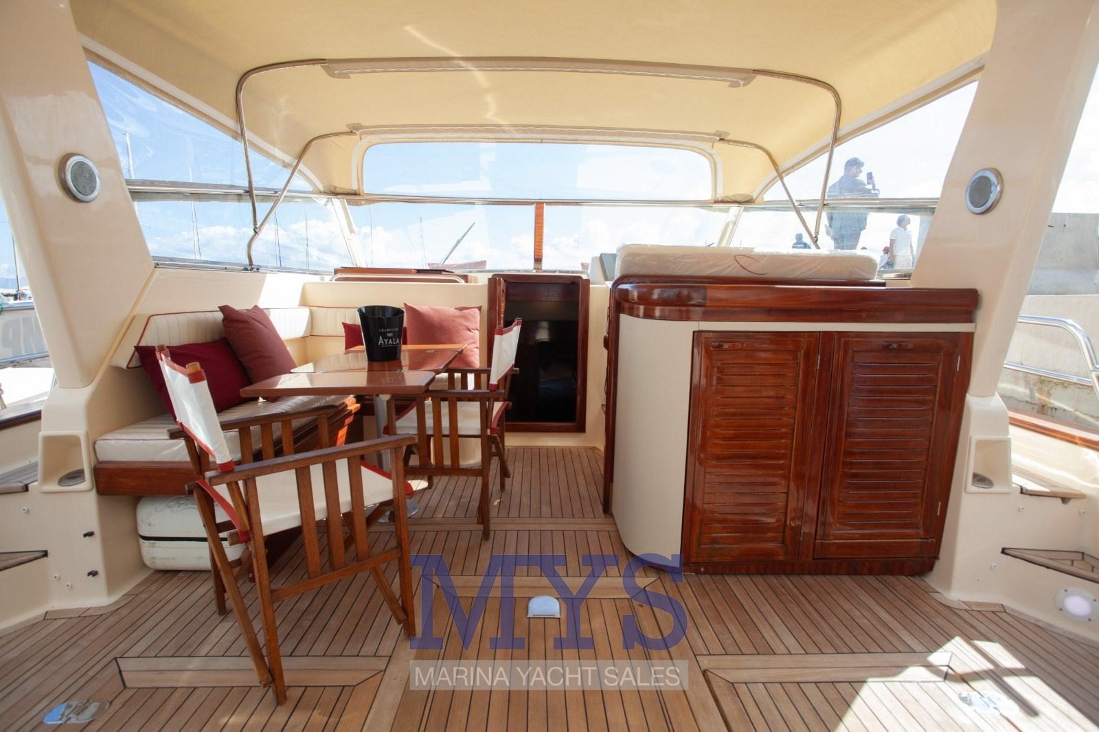 Allarme motore, Autoclave, Camminamenti laterali in teak, Doccia esterna, Faro orientabile, Flap idraulici, Hard top, Impianto antincendio, Indicatori Flaps, Lavaggio catena, Lavandino nel Pozzetto, Luci di cortesia, Passerella, Piattaforma, Pompa di sentina automatica, Ponte in teak, Pozzetto Teak, Presa 220V banchina, Presa acqua banchina, Salpa Ancore Elettrico, Scaletta da bagno, Tavolo pozzetto, Tromba.