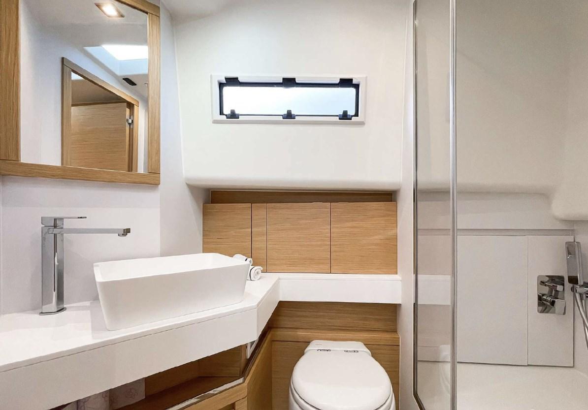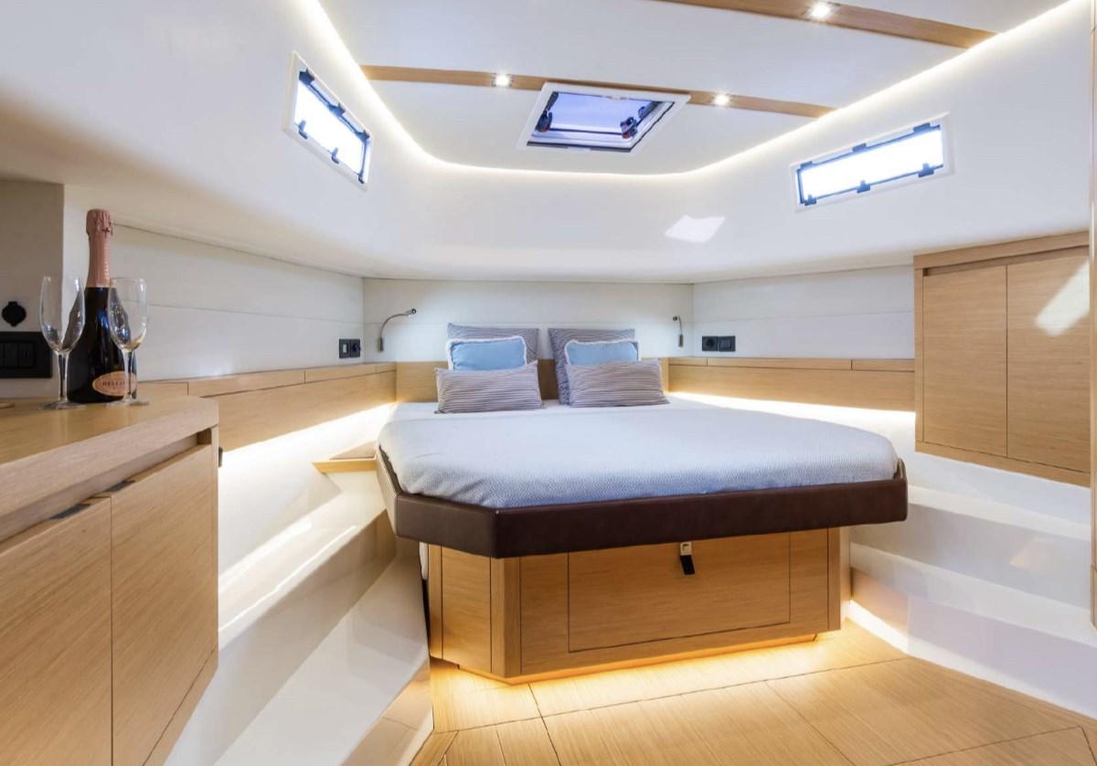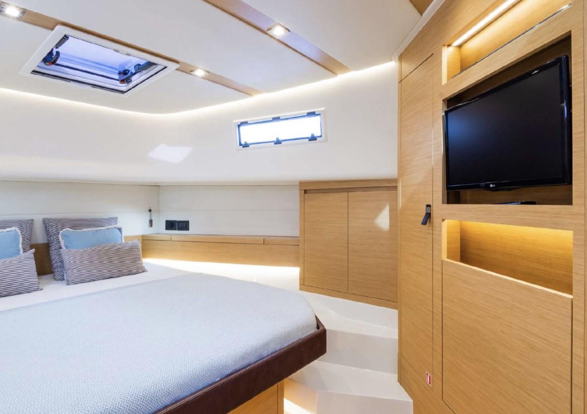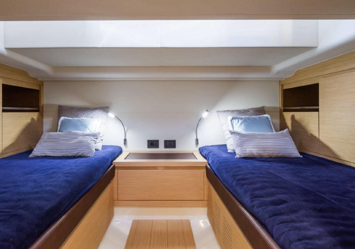 4 posti letto; 1 bagno; interni con paratia di separazione tra cabine, letto matrimoniale a penisola; cabina vip con 2 posti letto separati (poppa); bagno separato con doccia interni in rovere.