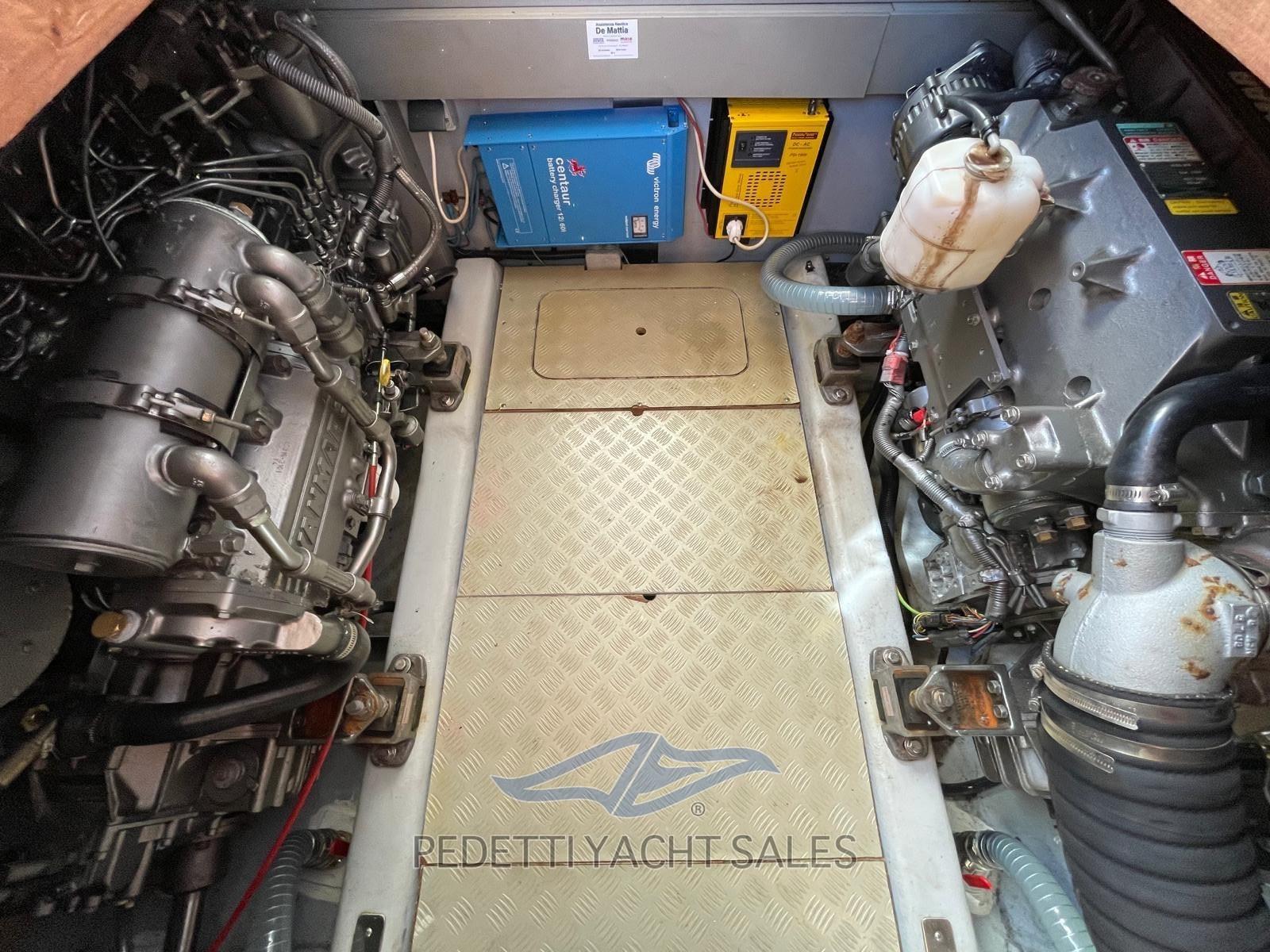 Allarme motore, Allarme sentina, Autoclave, 4 Batterie, Cavo corrente di banchina, Doccia esterna, Doppia timoneria, Impianto antincendio, Luci di cortesia, 6 Parabordi, Piattaforma, Pompa di sentina automatica, Pompa di sentina manuale, Porta ingresso, Pozzetto Teak, Presa 220V banchina, Raddrizzatore, Salpa Ancore Elettrico, Scaletta da bagno.