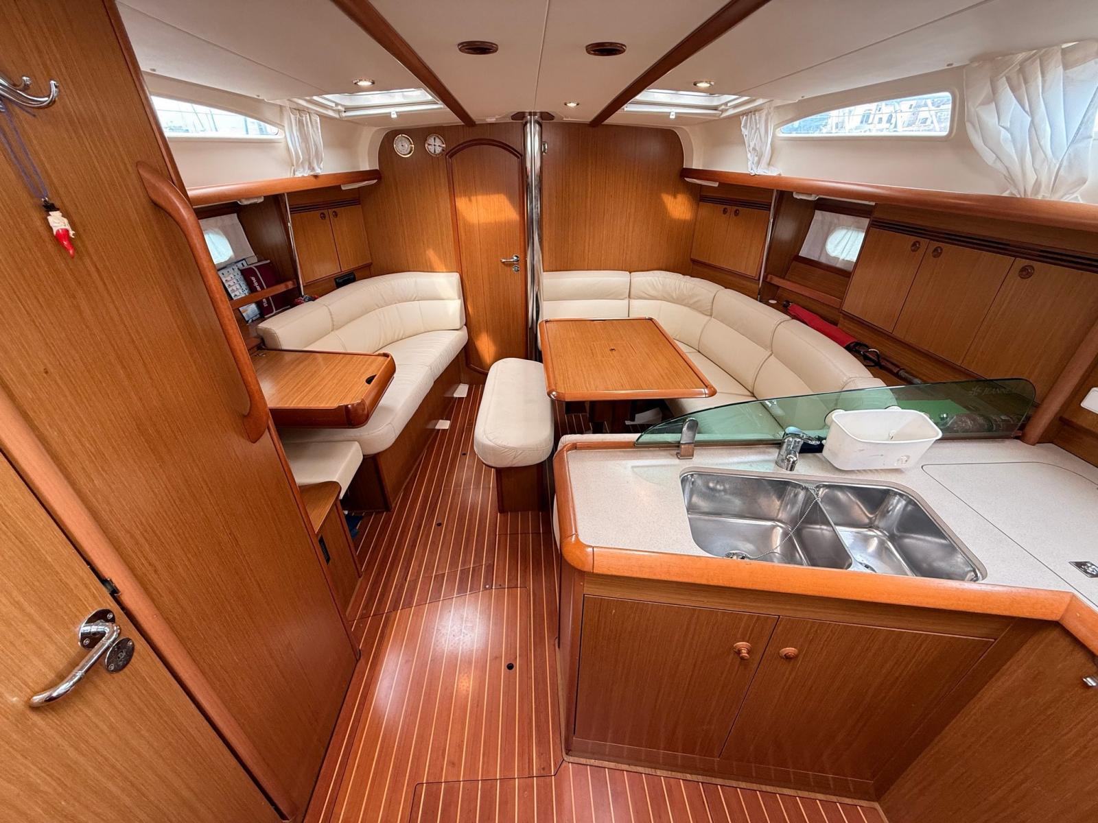 Interni caldi e luminosi con 3 cabine e 2 bagni, ampia dinette centrale e cucina completa.