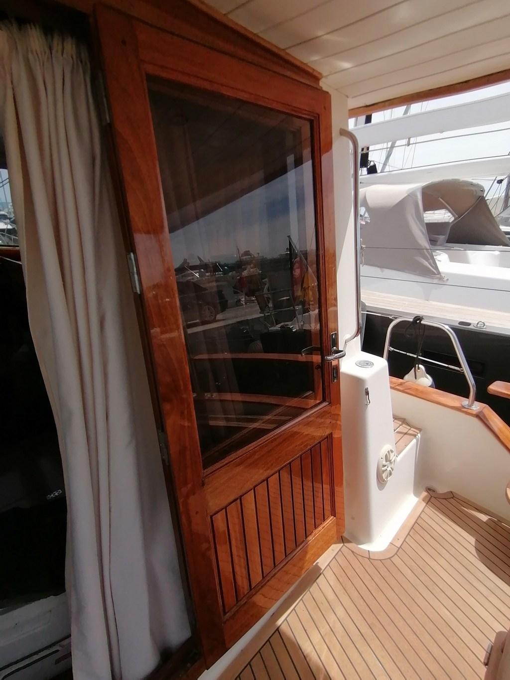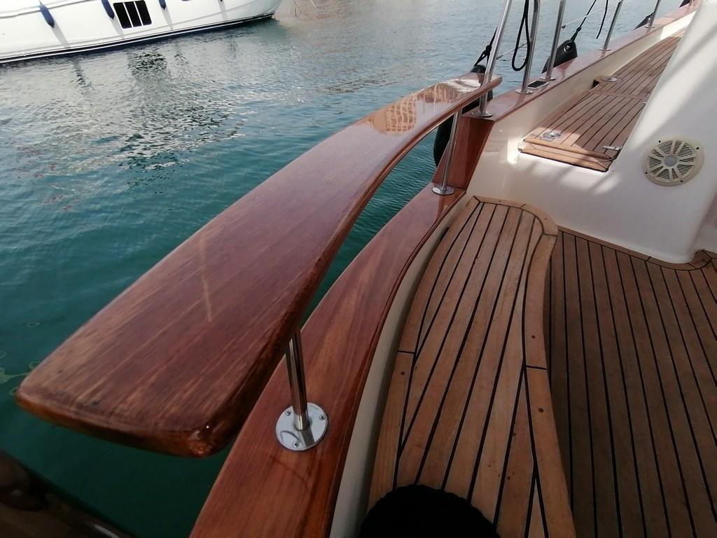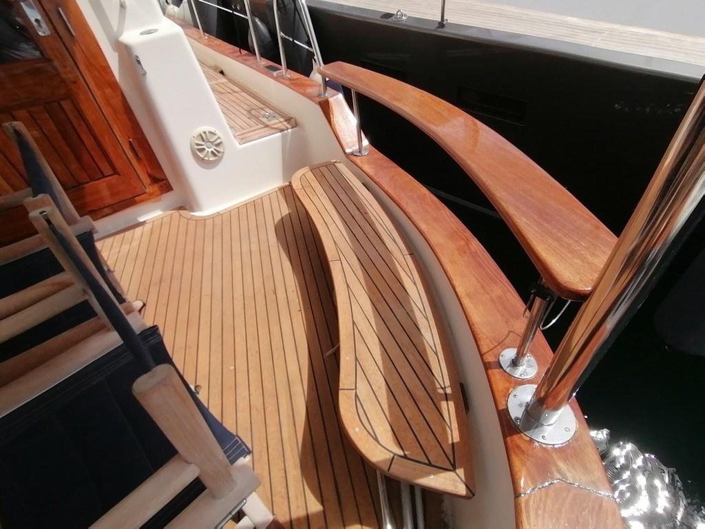 Allarme sentina, Autoclave, Camminamenti laterali in teak, Colorazione speciale (Blue hull), Doccia esterna, Doppia timoneria, Impianto antincendio, Motore fuoribordo per tender, Parabordi, Passerella, Ponte in teak, Pozzetto Teak, Salpa Ancore Elettrico, Scaletta da bagno, Tavolo pozzetto, Tender, Tuga in teak, Winch tonneggio di poppa.