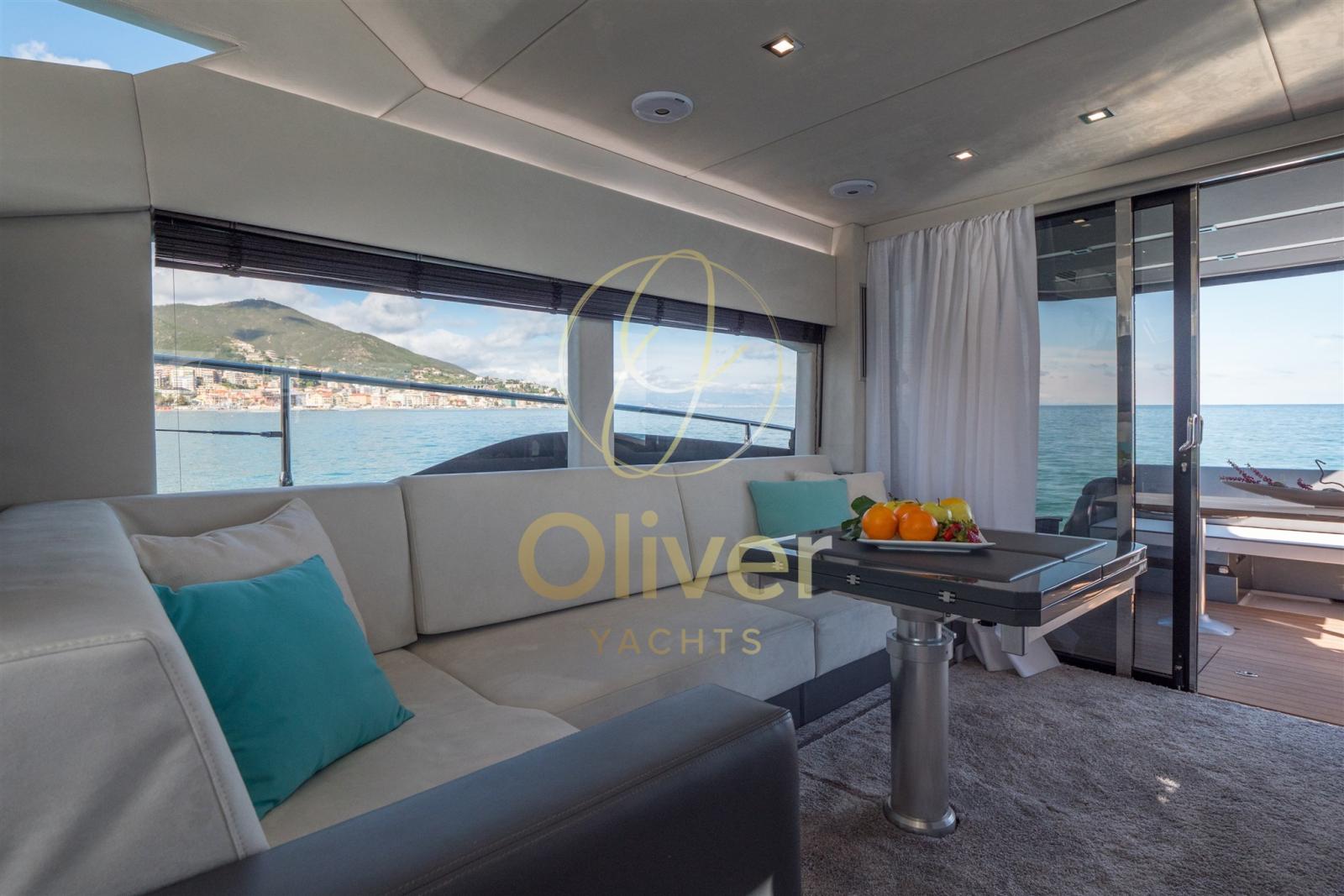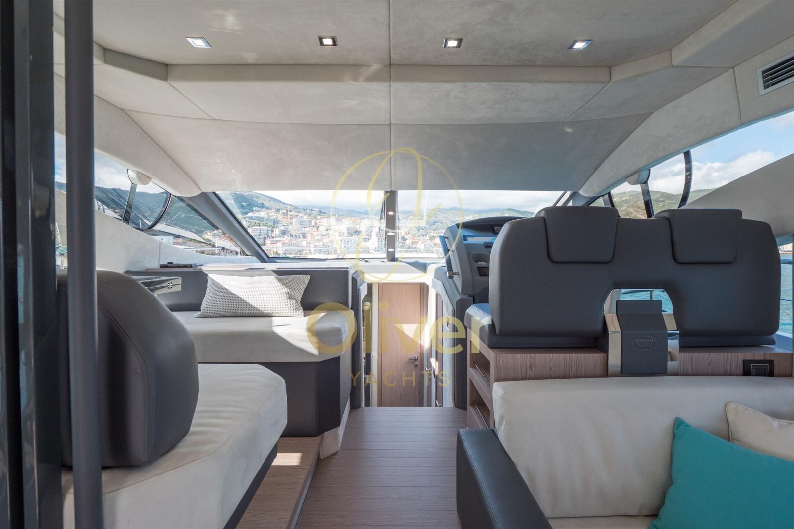 A bordo troviamo un salone inondato di luce grazie alle ampie vetrate, articolato in due zone living: un’area relax con divano e TV a scomparsa, e una zona conviviale accanto alla postazione guida con sedute e tavolino. La cucina fully-equipped richiama l’ambiente domestico con piano in acciaio inox, forno a microonde, frigorifero doppia anta e ampi vani di stivaggio. La cabina armatoriale, vera suite a tutta larghezza, dispone di grandi finestre panoramiche, guardaroba per due, piani d’appoggio capienti e bagno privato con box doccia e cromoterapia. I materiali – pelle, laccati, legno e tessuti – stabiliscono un’atmosfera calda e sofisticata.