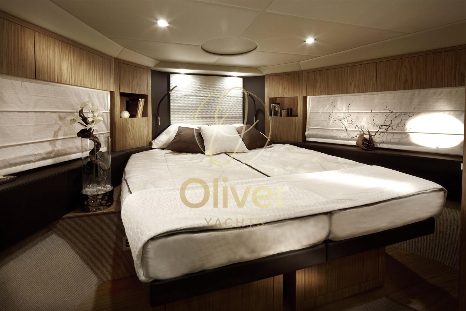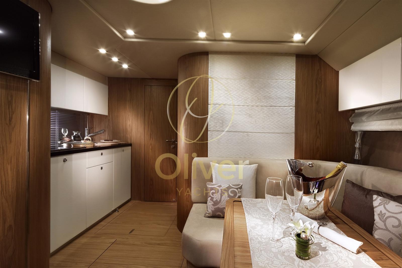 Nel caso della F48: 3 cabine, 2 bagni, scelta tra cucina a midships o cucina in pozzetto, flybridge con zona lounge/bar, grandi finestre/passaggi che integrano interno ed esterno.