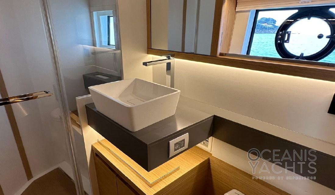 The lower deck fits a twin cabin on starboard with her ensuite bathroom. The third cabin has been accommodated in the main salon where the crew cabin