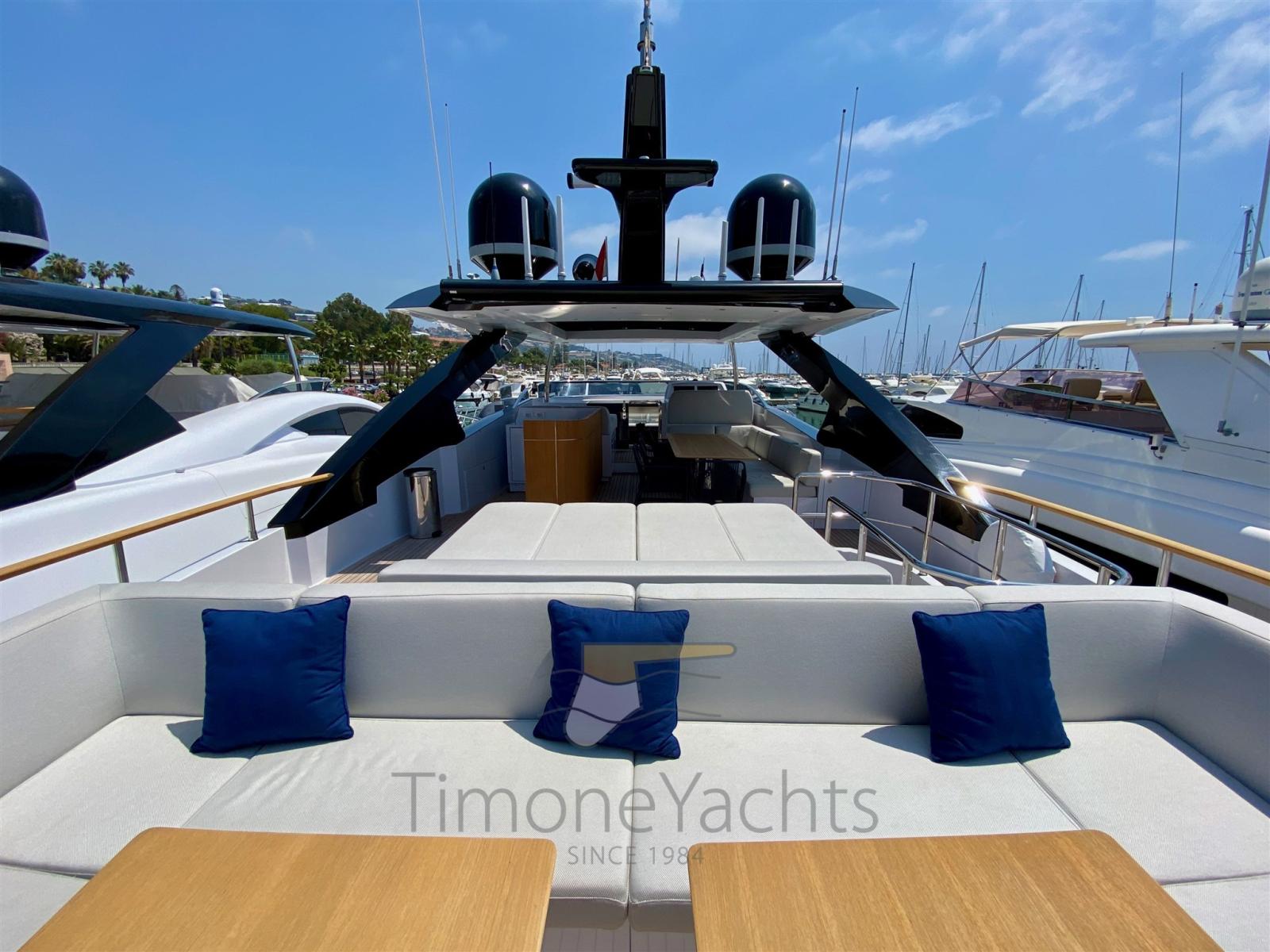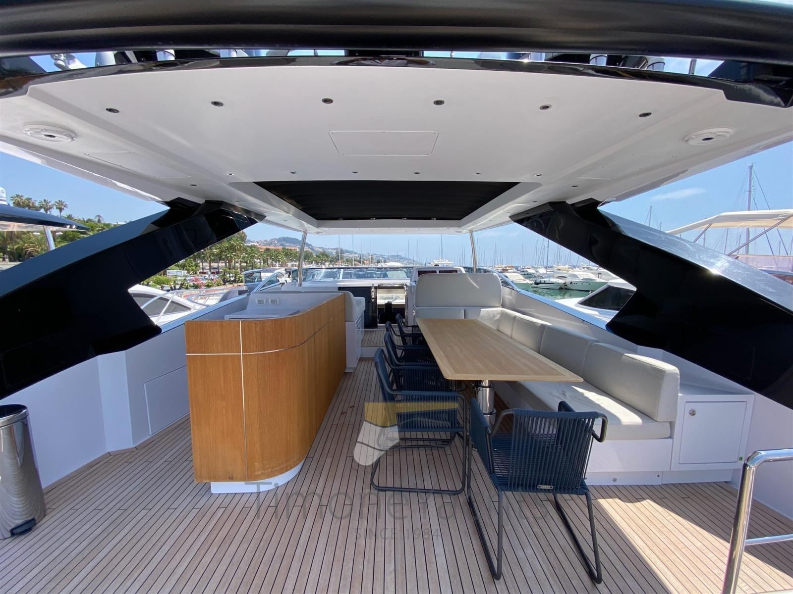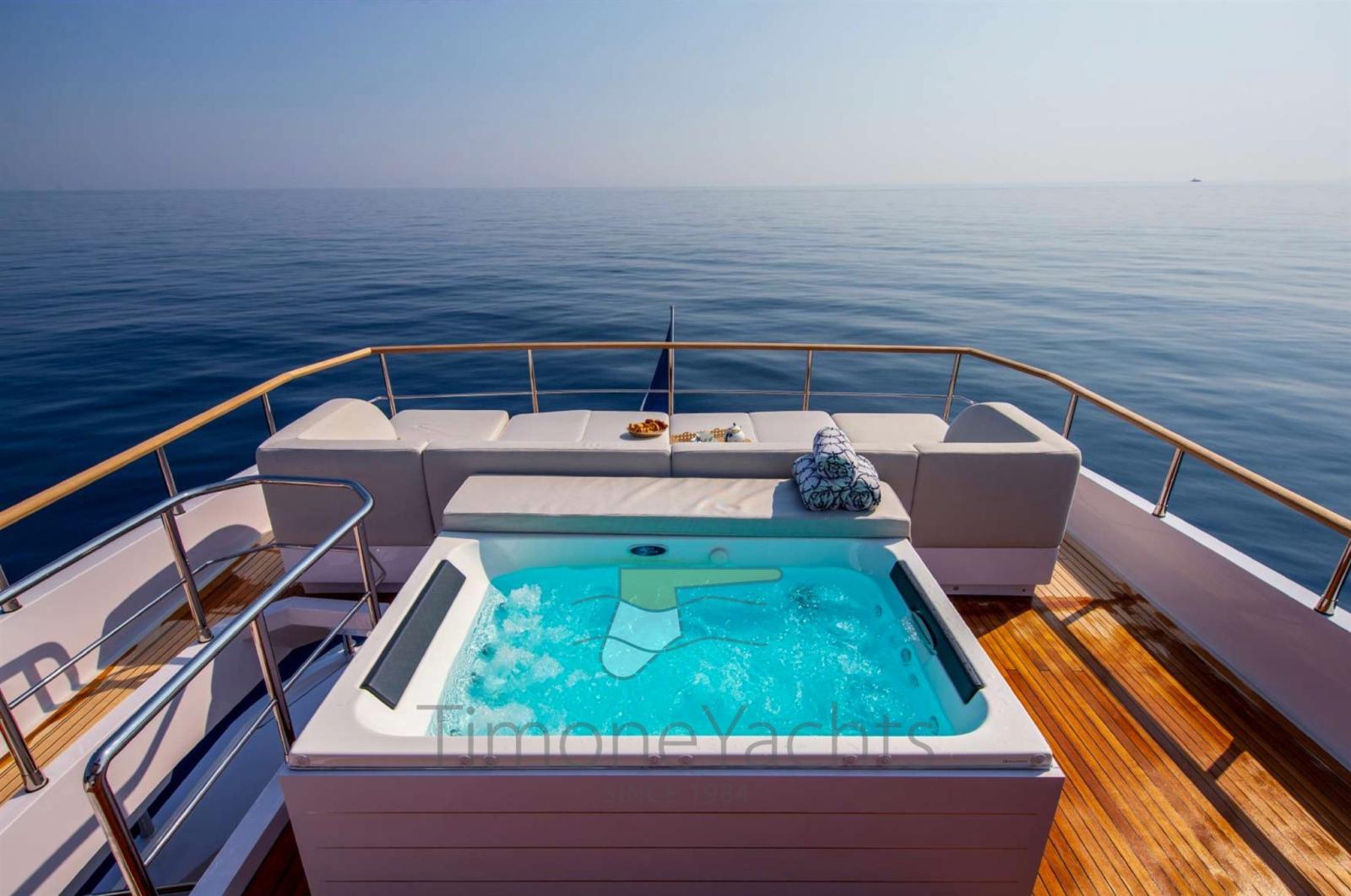 Auto Dynamic Trim Interceptor, Auto-Trim, Camminamenti laterali in teak, Doccia esterna, Fari fissi a poppa, Faro orientabile, Flap elettrici (Humphree automatic), Garage per tender, Hard top, Impianto antincendio, Indicatori Flaps, Lavaggio catena, Luci di cortesia, Luci subacquee, Passerella, Porta laterale, Pozzetto Teak, Presa 220V banchina, Presa acqua banchina, Stabilizzatori (1 pair of Humpree fins (electric) + nr.1 Seakeeper NG 26), Tavolo pozzetto, Tender (4.2 mts + 40 hp outboard), Tromba, Winch tonneggio di poppa, Winch tonneggio di prua.