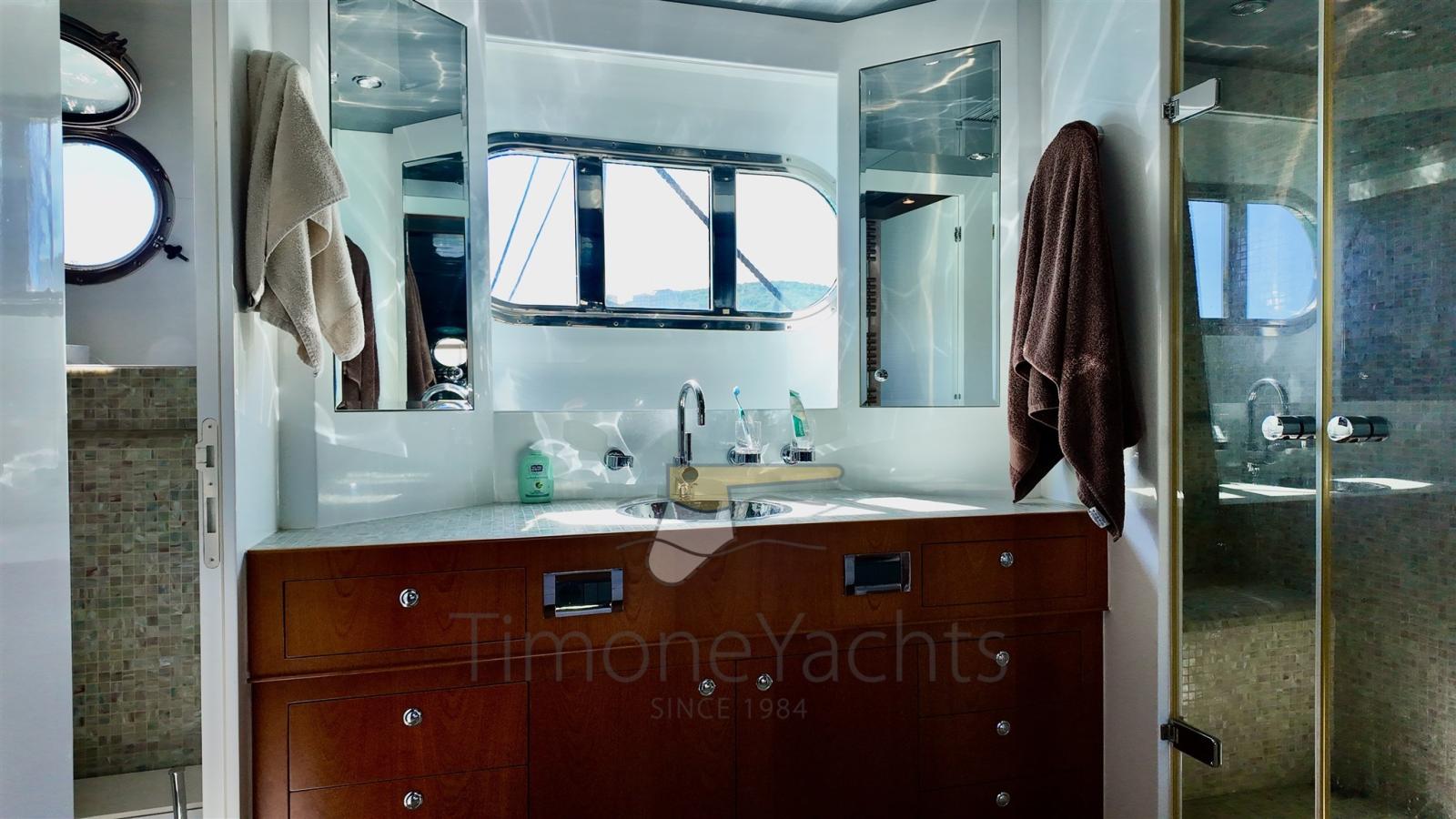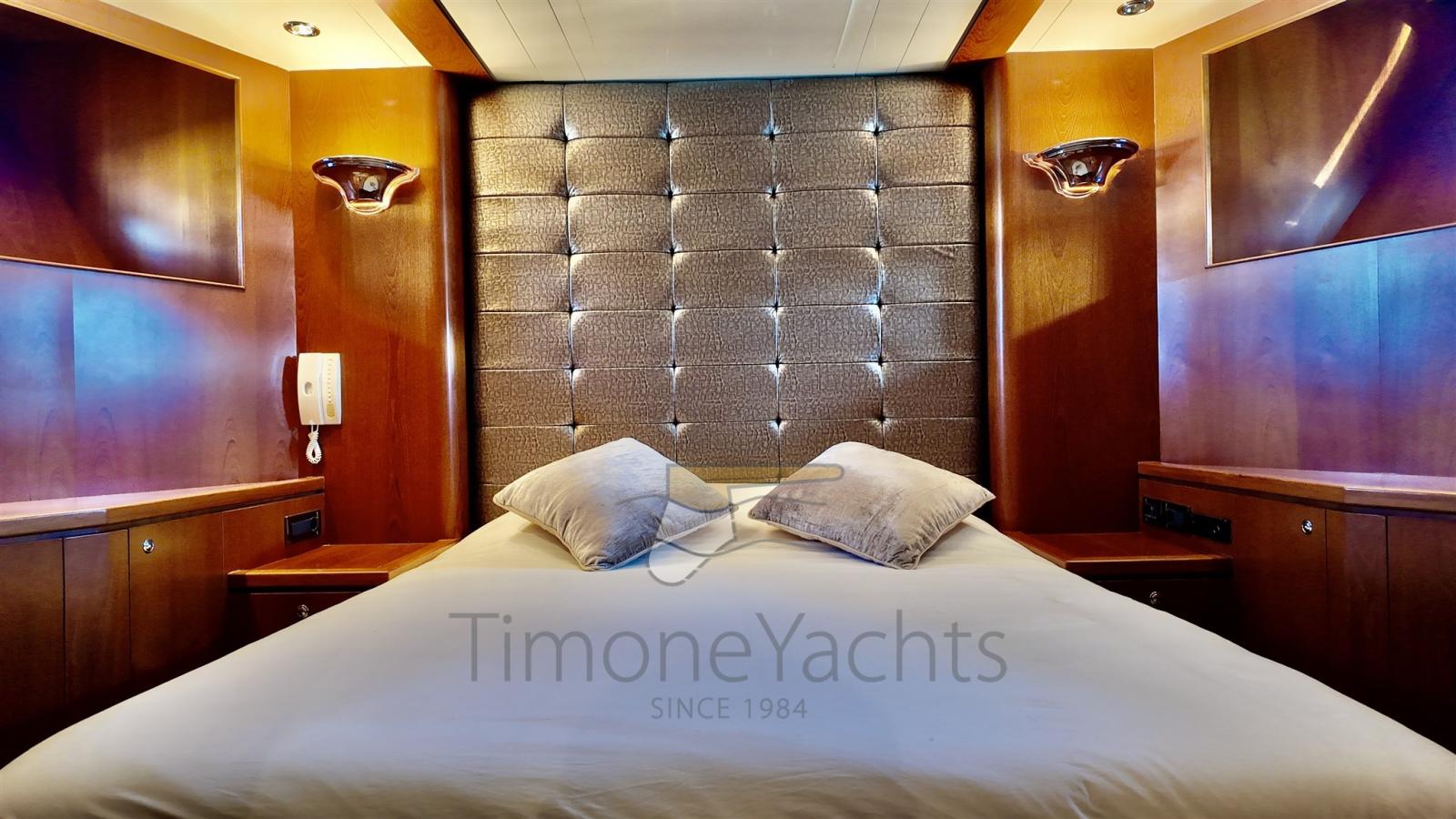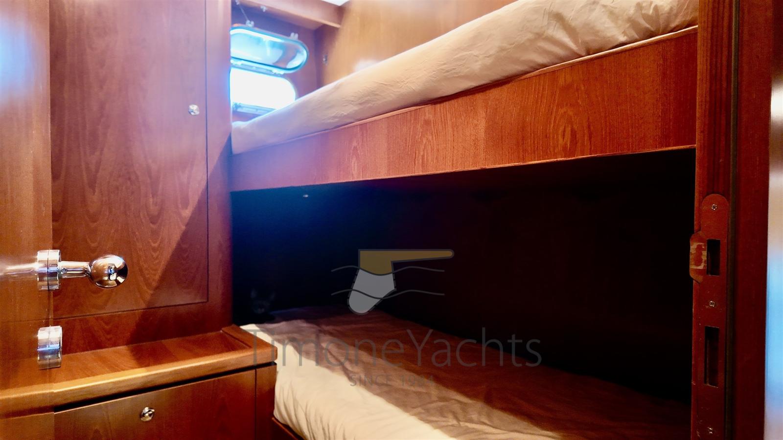 Questa unità offre un layout a 4 cabine, tra cui una spaziosa suite armatoriale a tutto baglio a centro barca, una cabina VIP a prua, una seconda cabina VIP con letto matrimoniale a sinistra, e due letti singoli pullman per gli ospiti a dritta. Il bagno di servizio sul ponte principale, ancora una volta immenso. Completamente ristrutturata nel 2017, vanta numerosi aggiornamenti, tra cui stabilizzatori Wesmar a pinne, propulsori idraulici a prua e a poppa e una postazione di comando in pozzetto per una manovrabilità impeccabile.