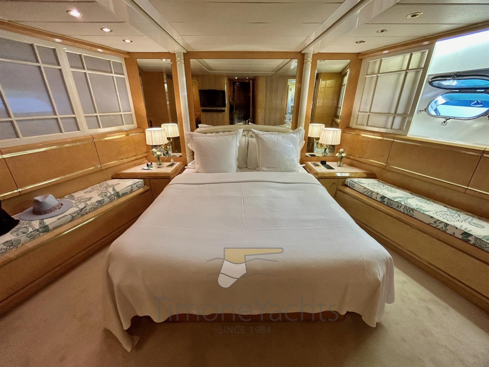 This 1995 Mangusta 92 is surprisingly still in her first Owner's hands. And during my inspection it was quite easy for me to understand why he kept the unit so long. We're in front of a pure open boat, with the bliss of stern sunpads and airy cockpit, naturally voted for entertaining in style right overwater. But yet the interiors benefits of the comfort that a large motoryacht can offer. The interior salon is lowered and reminds of the one coming (many) years later on the Mangusta 130.