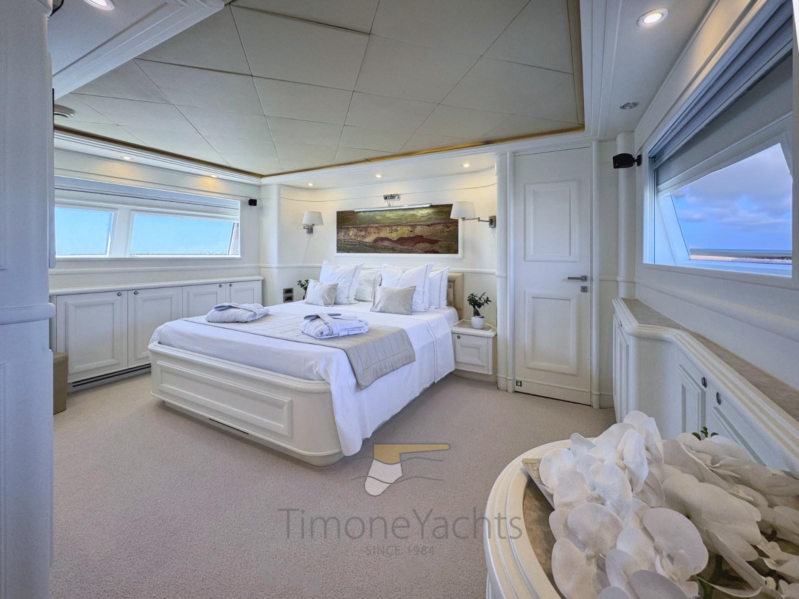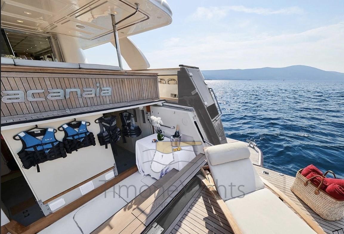 Camminamenti laterali in teak, Doccia esterna, Fari fissi a poppa, Faro orientabile, Flap idraulici, Garage per tender, Gruette per tender su fly, Impianto antincendio, Indicatori Flaps, Lavaggio catena, Luci di cortesia, Luci subacquee, Moto d'acqua (Seadoo 60hp (year 2023)), Passerella, Porta laterale, Pozzetto Teak, Presa 220V banchina, Presa acqua banchina, Sistema Depurazione acque nere (Hamann), 4 Stabilizzatori (nr.3 ARG gyro + fins), Tavolo pozzetto, Tender (Saxador 200 sport (year 2023)), Tromba, 2 Winch tonneggio di poppa, 2 Winch tonneggio di prua.