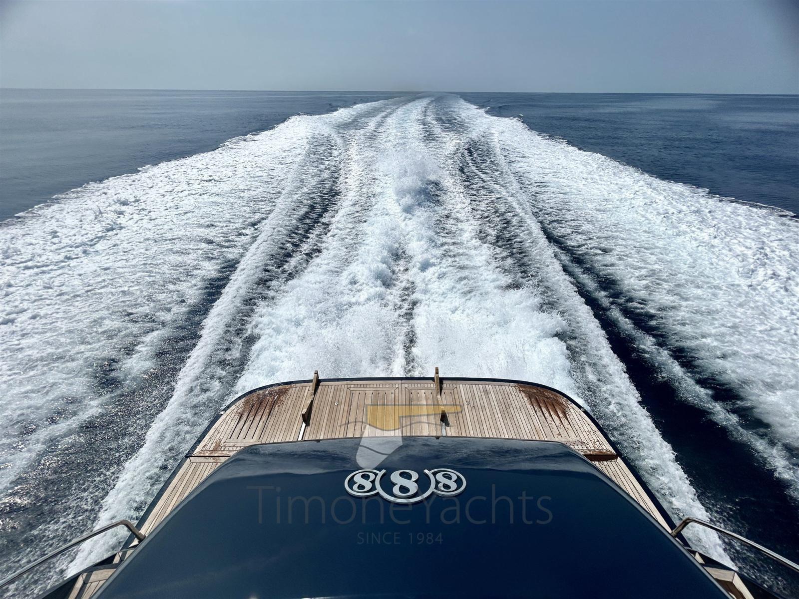 Autoclave, Camminamenti laterali in teak, Doccia esterna, Fari fissi a poppa, Faro orientabile, Flap idraulici, Garage per tender (capable of 3.6 outboard dinghy), Gruette per tender su fly, Impianto antincendio, Indicatori Flaps, Lavaggio catena, Luci di cortesia, Luci subacquee, Passerella, Piattaforma, Pompa di sentina manuale, 2 Porta laterale, Pozzetto Teak, Presa 220V banchina, Presa acqua banchina, Raddrizzatore, Scaletta da bagno, 2 Stabilizzatori (Mitsubishi ARG), Tavolo pozzetto, Tromba, 2 Winch tonneggio di poppa, 2 Winch tonneggio di prua.