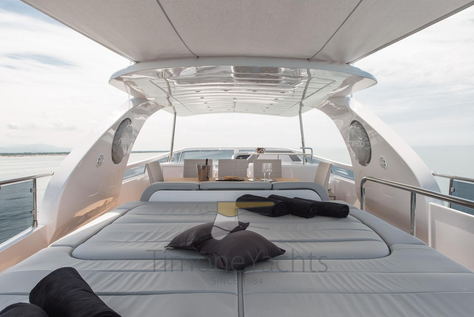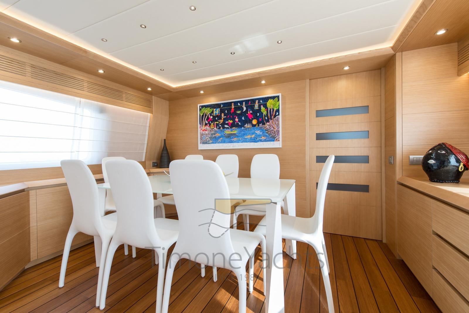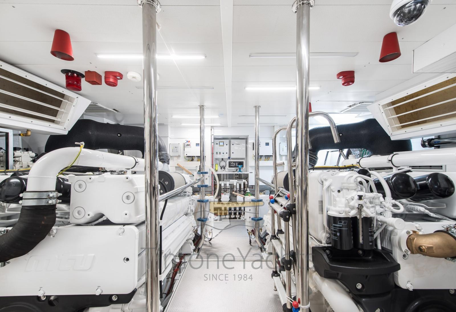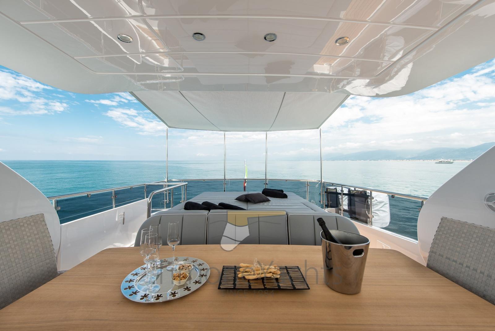 CMC electric fins (zero speed + navigation), watermaker Idromar, bow + stern thristers, carbon fiber Hard Top on fly, domotic touch screen at the dash + redundant manual back up in ER + dedicated App, tender Williams 385, up/down platform astern, Icemaker with drinking water dedicated supply, jacuzzi tub on fly, cockpit enclosure, fresh water plug in bow anchor room, sliding beds in midship twins each one with pullman bed, underwater lights, flybridge tv system, teak on fly, sink + fridge cabinet on fly, nr 2 grill BBQ separate cabinet on fly, tv plug predisposition on front dinette, portholes alarms, nr.3 camera system, centralized hoover, yacht controller, safe in master cabin + front crew cabin + Captain cabin astern, Audio-Video entertainment system: Samsung TV + BOSE audio.