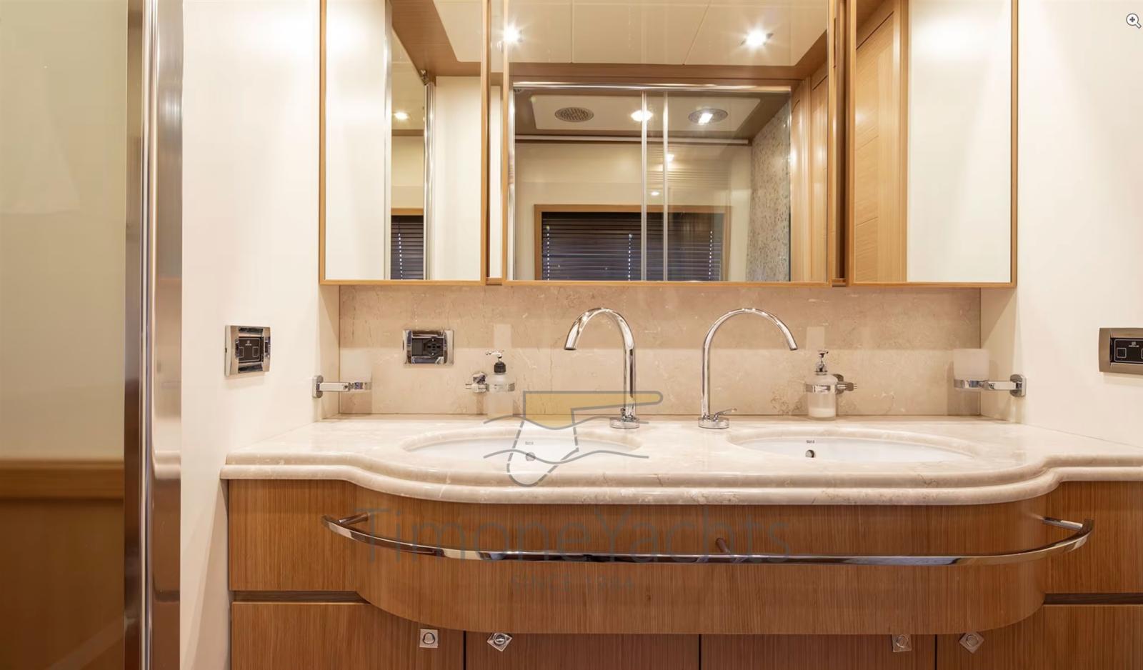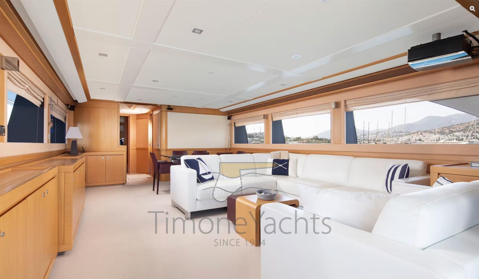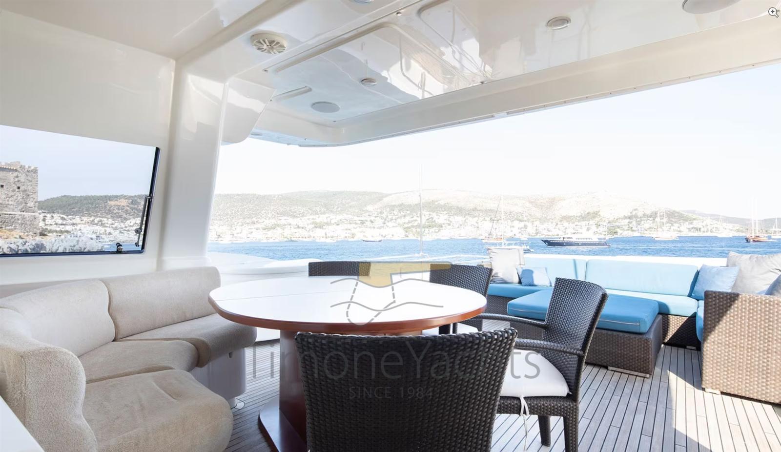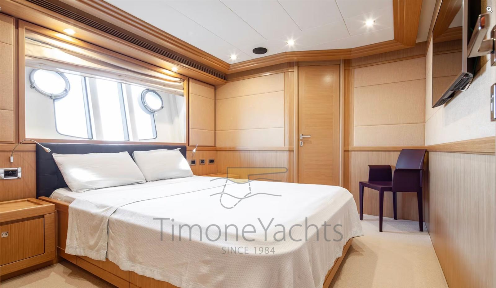Alternatore, Autoclave, Camminamenti laterali in teak, Doccia esterna, Doppia timoneria, Faro orientabile, Garage per tender, Gruette per tender su fly, Hard top, Impianto antincendio, Lavaggio catena, Lavandino nel Pozzetto, Luci di cortesia, Passerella, Ponte in teak, Porta ingresso, 4 Porta laterale, Pozzetto Teak, Presa 220V banchina, Presa acqua banchina, Selle per Tender, Stabilizzatori (Zero Speed Stabilizers), Tavolo pozzetto, Tender (4.3m Capelli tender with 70hp Yamaha engine), Tromba, 2 Winch tonneggio di poppa, Winch tonneggio di prua.