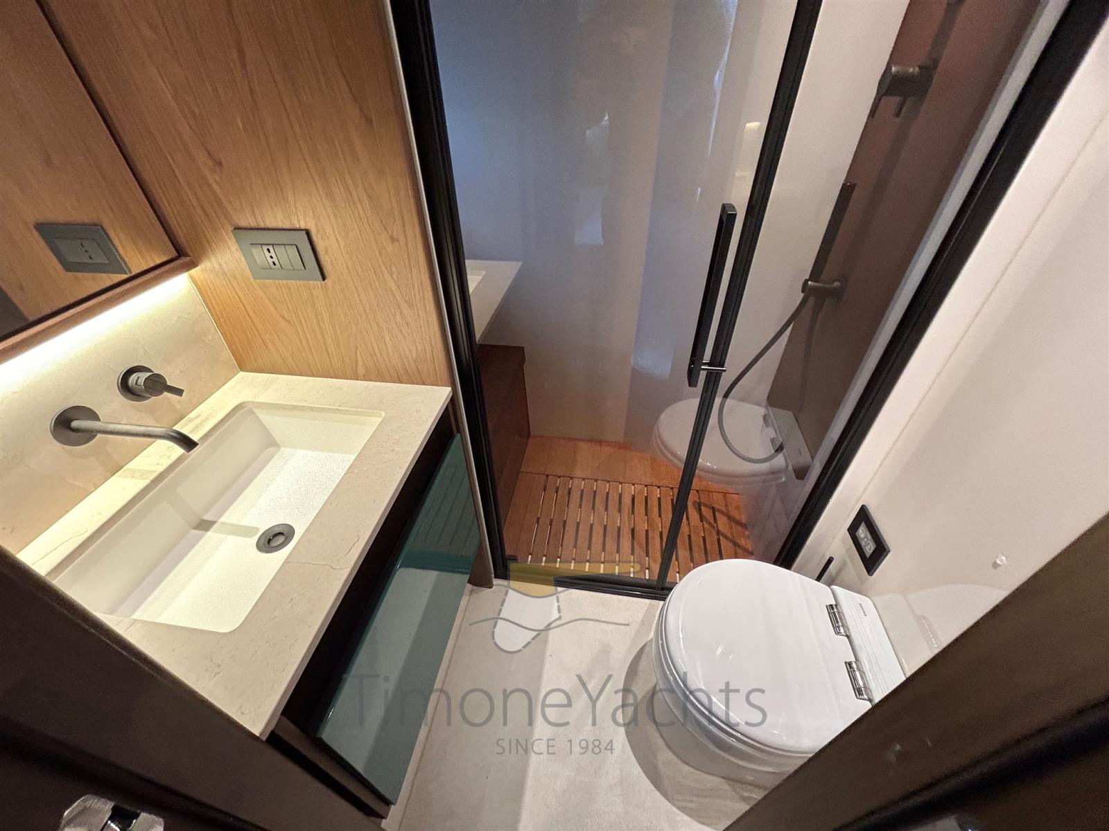 BBQ/ Grill, Boiler, Clima reversibile, Controllo Domotica, Dimmer per Luci, Dissalatore, Impianto acque nere, Pavimento interno in legno, Prese interne 12v, Prese interne 220v, Serbatoio Acque Nere, 4 WC marino elettrico (+ crew).