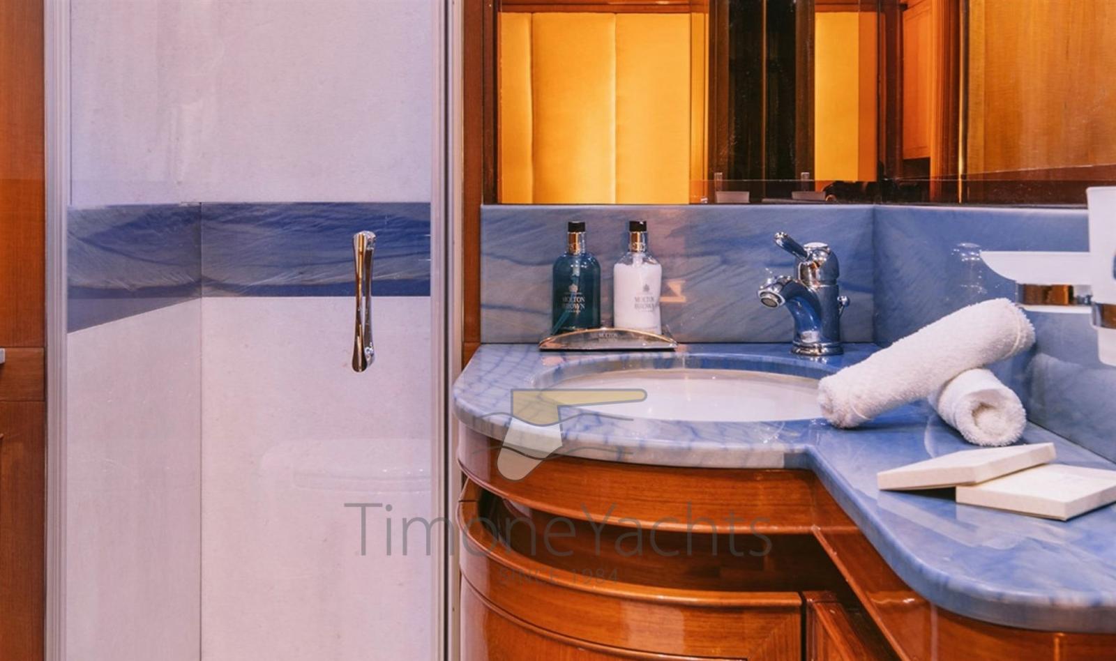 10 Batterie (18 x Varta), Camminamenti laterali in teak, Doccia esterna, Faro orientabile, Gruette per tender, Gruette per tender su fly, Impianto antincendio, Indicatori Flaps, Lavaggio catena, Luci di cortesia, Luci subacquee, Passerella, Ponte in teak, 2 Porta laterale, Pozzetto Teak, Scaletta da bagno, Tavolo pozzetto, Tender (Grant S 4.30m Yamaha 60 hp), Tromba, Winch tonneggio di poppa.