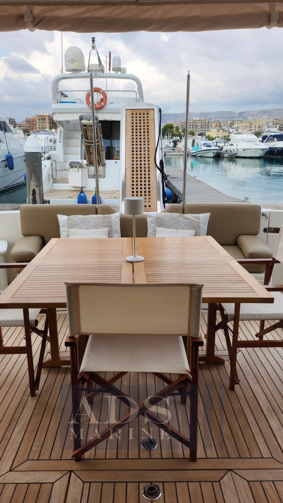 Allarme fumo/gas, 2 Allarme motore, Allarme sentina, Autoclave, Camminamenti laterali in teak, Doccia esterna, Doppia timoneria, Faro orientabile, Flap idraulici, Impianto antincendio, Luci di cortesia, Piattaforma (elettroidraulica , Kg 400), 4 Pompa di sentina automatica, Porta ingresso, Pozzetto Teak, Presa 220V banchina, Raddrizzatore, Salpa Ancore Elettrico, Scaletta da bagno, Tromba.
