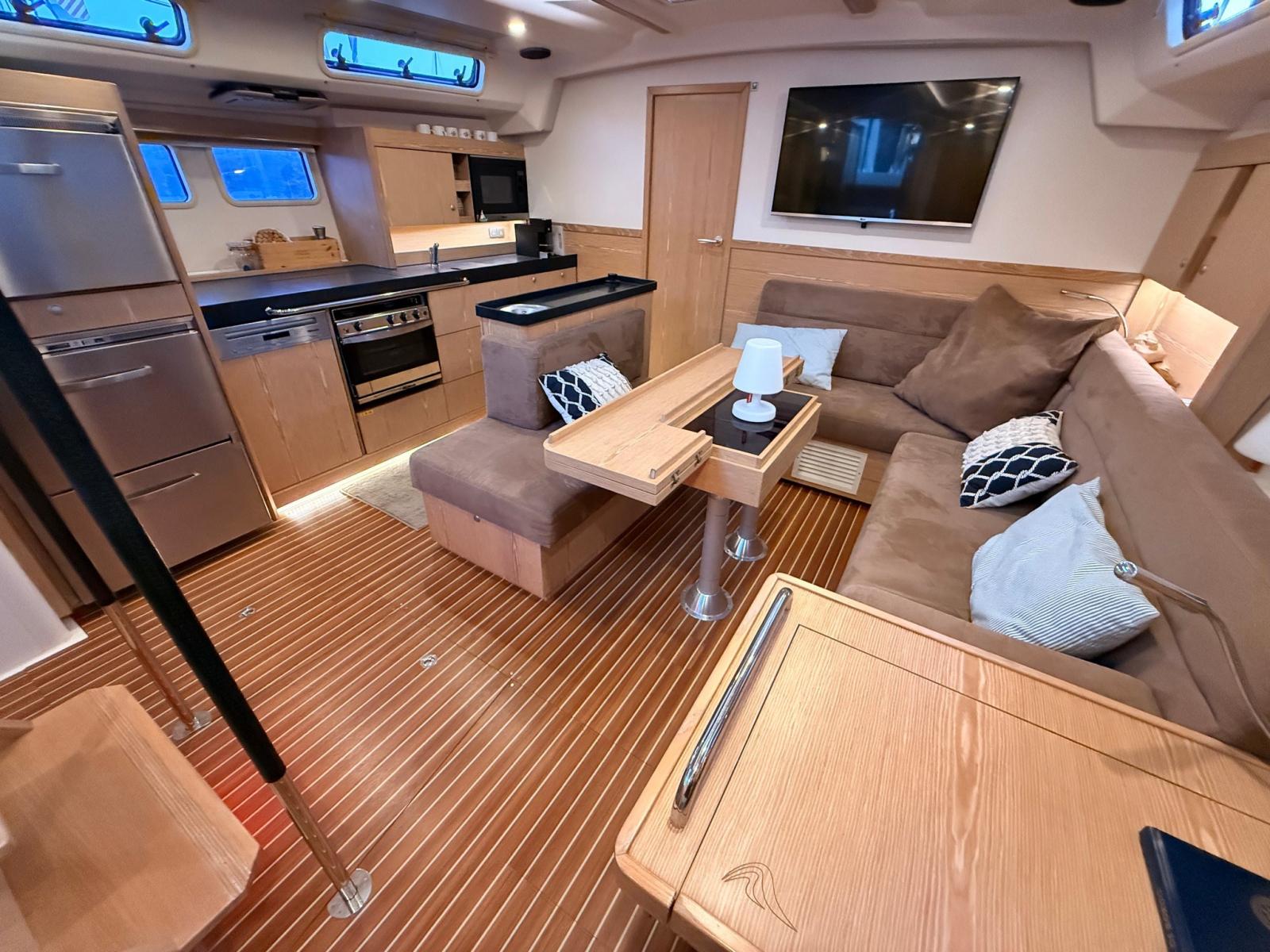 Interni luminosi e moderni con ampi spazi abitativi, cucina completa e cabine con bagno privato.