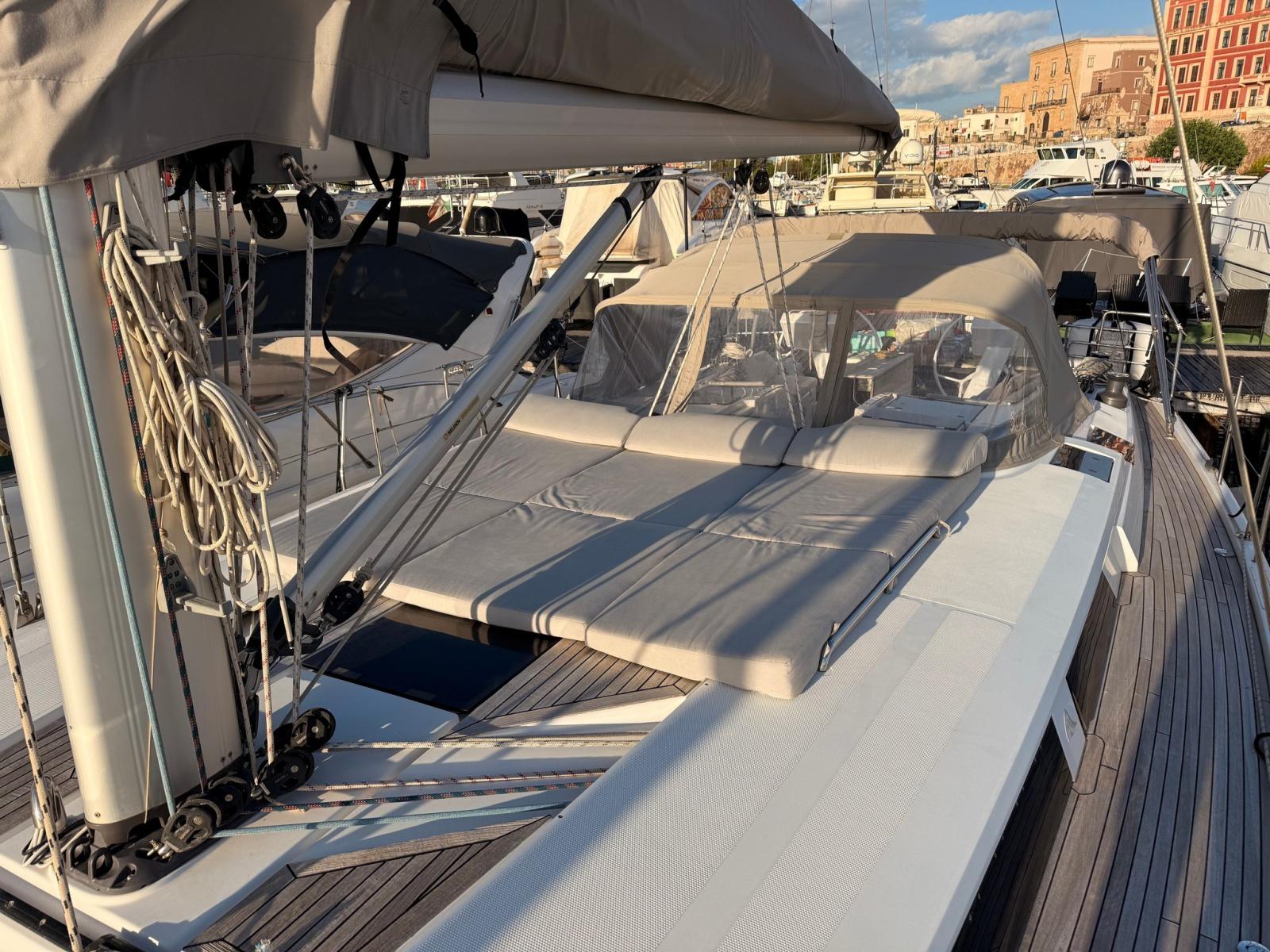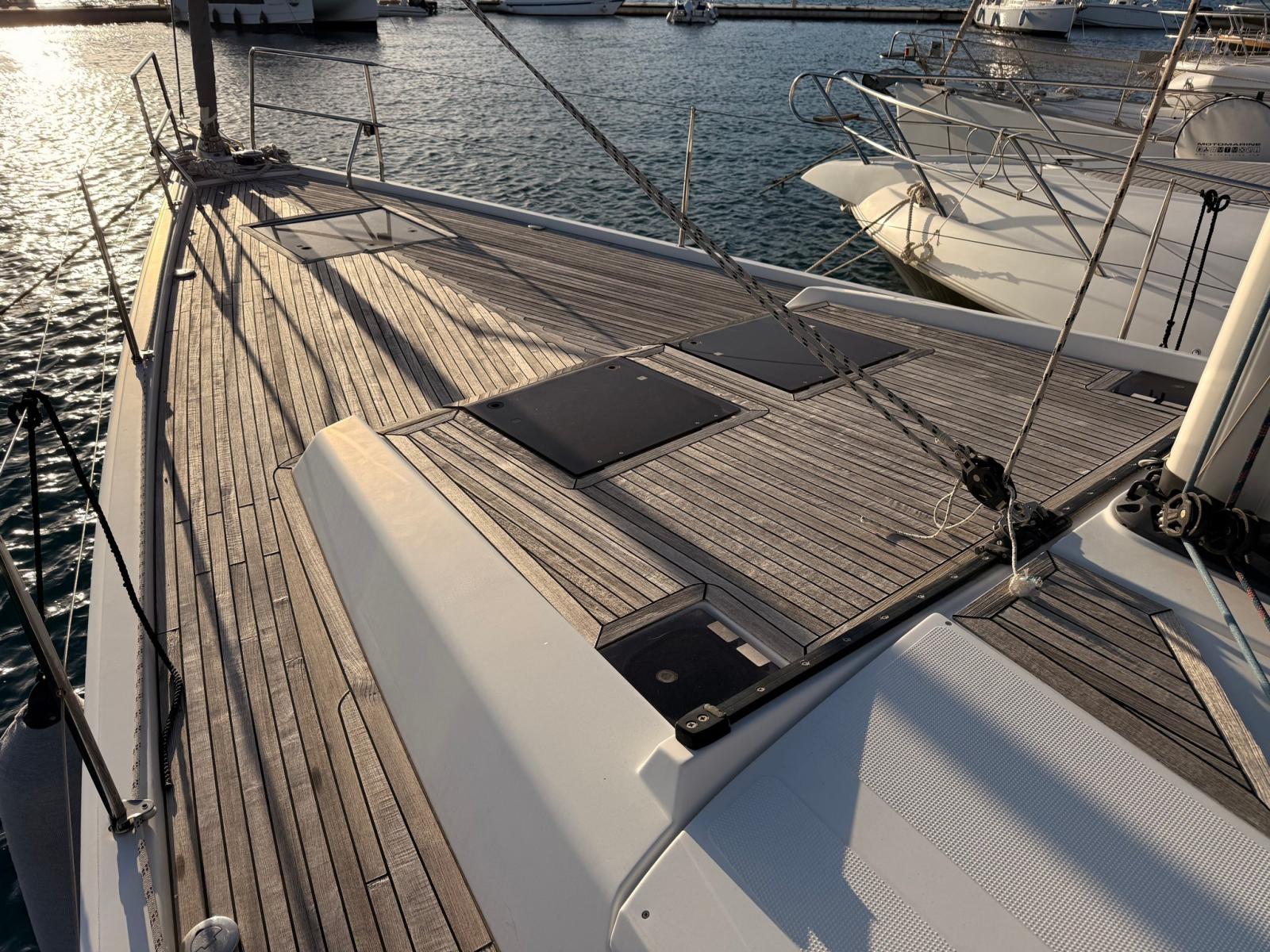 Ancora (ACCIAIO ULTRA 27KG), Autoclave, 8 Batterie, Camminamenti laterali in teak, Doccia esterna, Doppia timoneria, Elica di prua - bow thruster (QUICK RETRATTILE), Parabordi, Passerella, Piattaforma (ELETTRICA), Pompa di sentina manuale, Porta ingresso, Pozzetto Teak, Presa 220V banchina, Presa acqua banchina, Salpa Ancore Elettrico, Sartiame spiroidale, Scaletta da bagno, Supporto motore fuoribordo, Tavolo pozzetto, 4 Winch.
