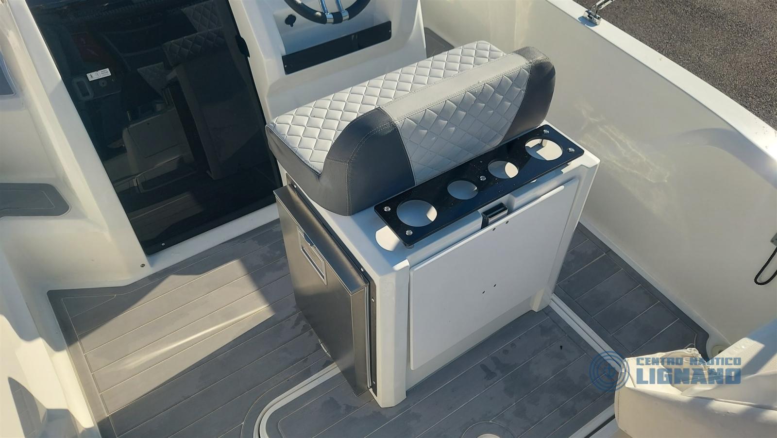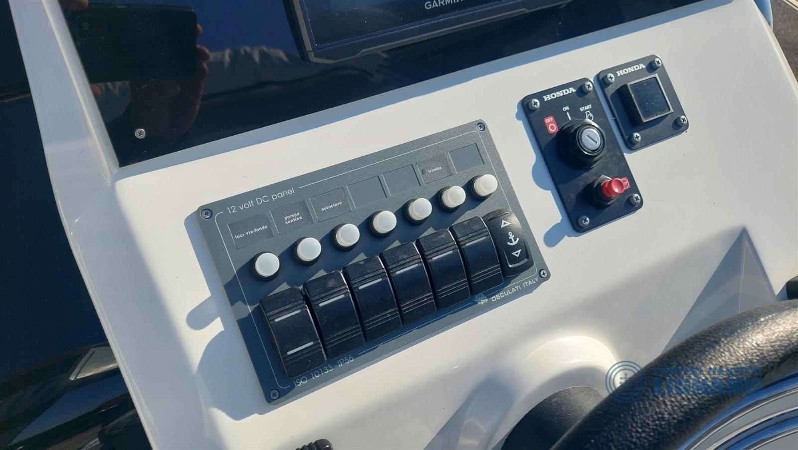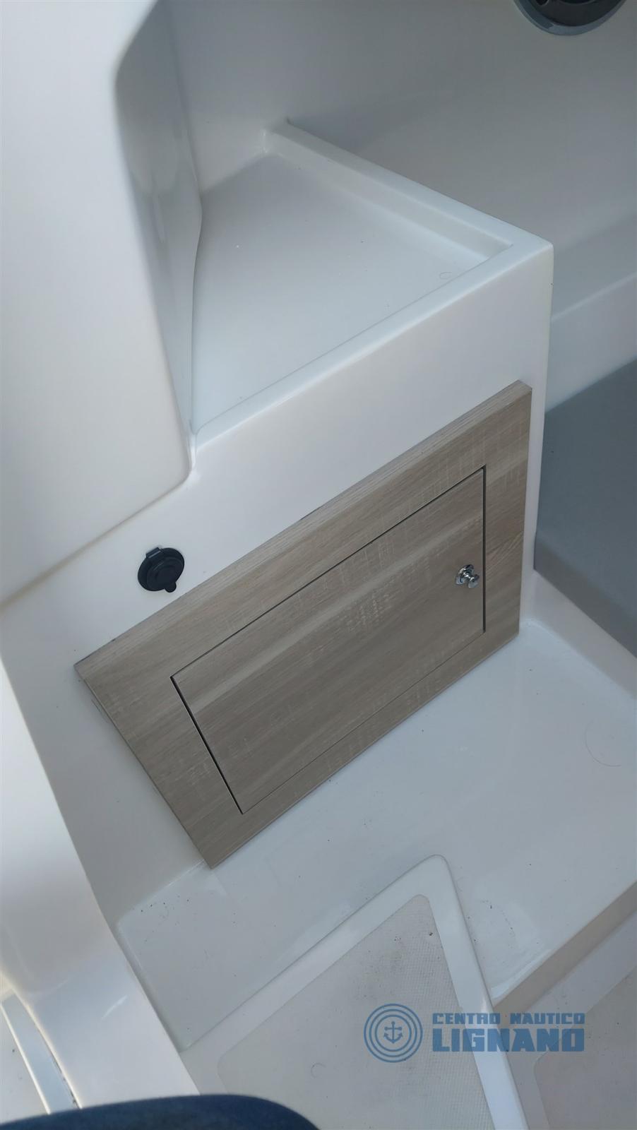 Dotazioni di bordo: mobile speciale in pozzetto con tavolo integrato e frigoriero in acciaio inox con ghiacciaia, GPS Garmin Echomap UHD 7 CV con mappa e trasduttore di poppa, full tek sintetico grigio in tinta con cuscinerie e colore fiancata, impianto elettrico con doppia batteria, impianto doccia con serbatoio, impianto WC marino elettrico, secondo oblò in cabina, verricello elettrico ancora e catena, secondo domando a prua per verricello, tendalino parasole in acciaio inox, tromba, kit teli di copertura ( 3 pezzi ), impianto carburante fisso 82 lt con tappo d'imbarco, 2 prese accendino , serbatoio acqua con impianto doccia, luce in cabina, cuscinerie complete bicolore grigio e perfette, impianto doppia batteria con deviatore, filtro benzina decantatore.