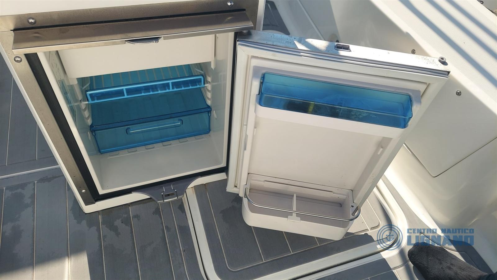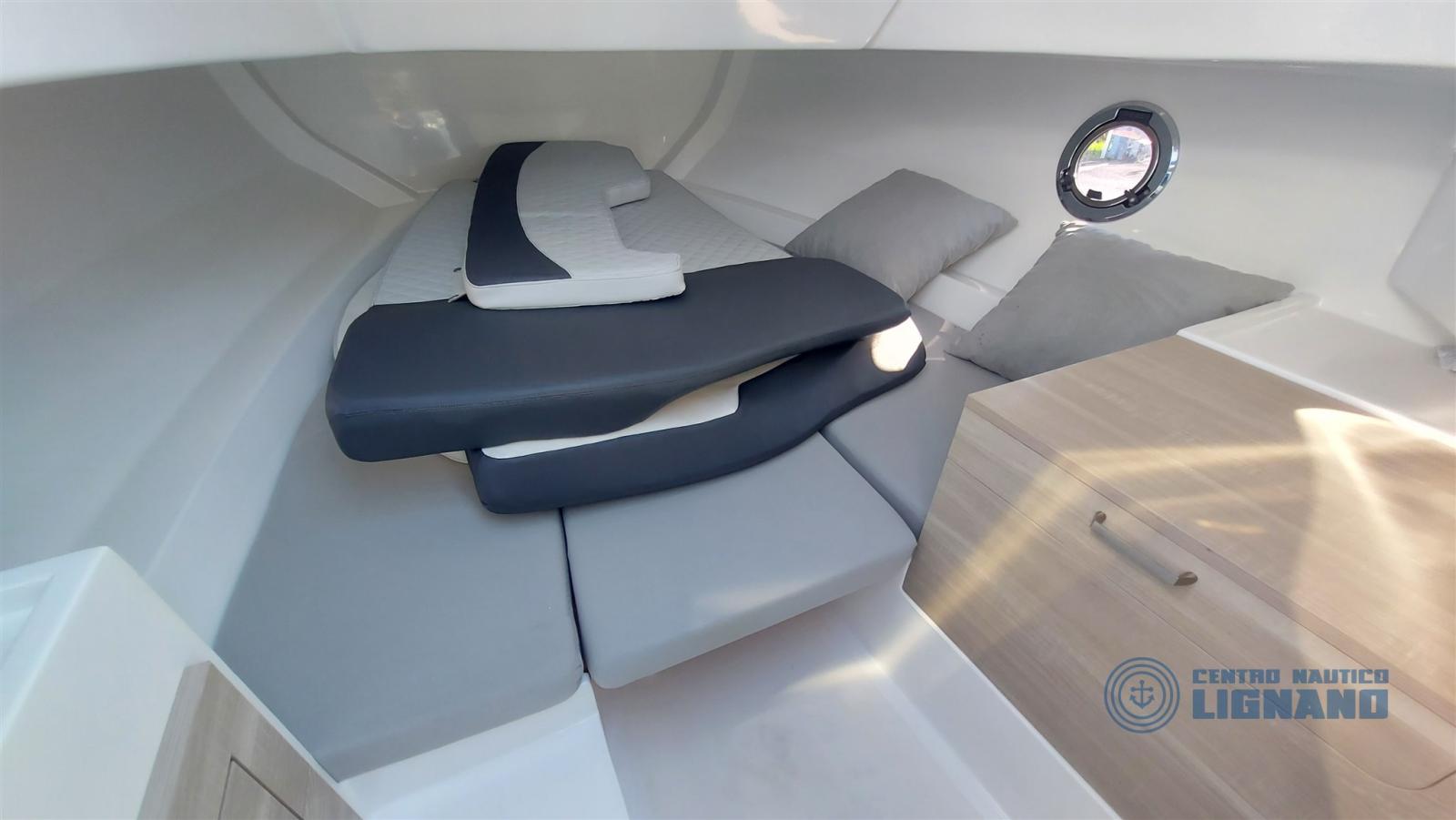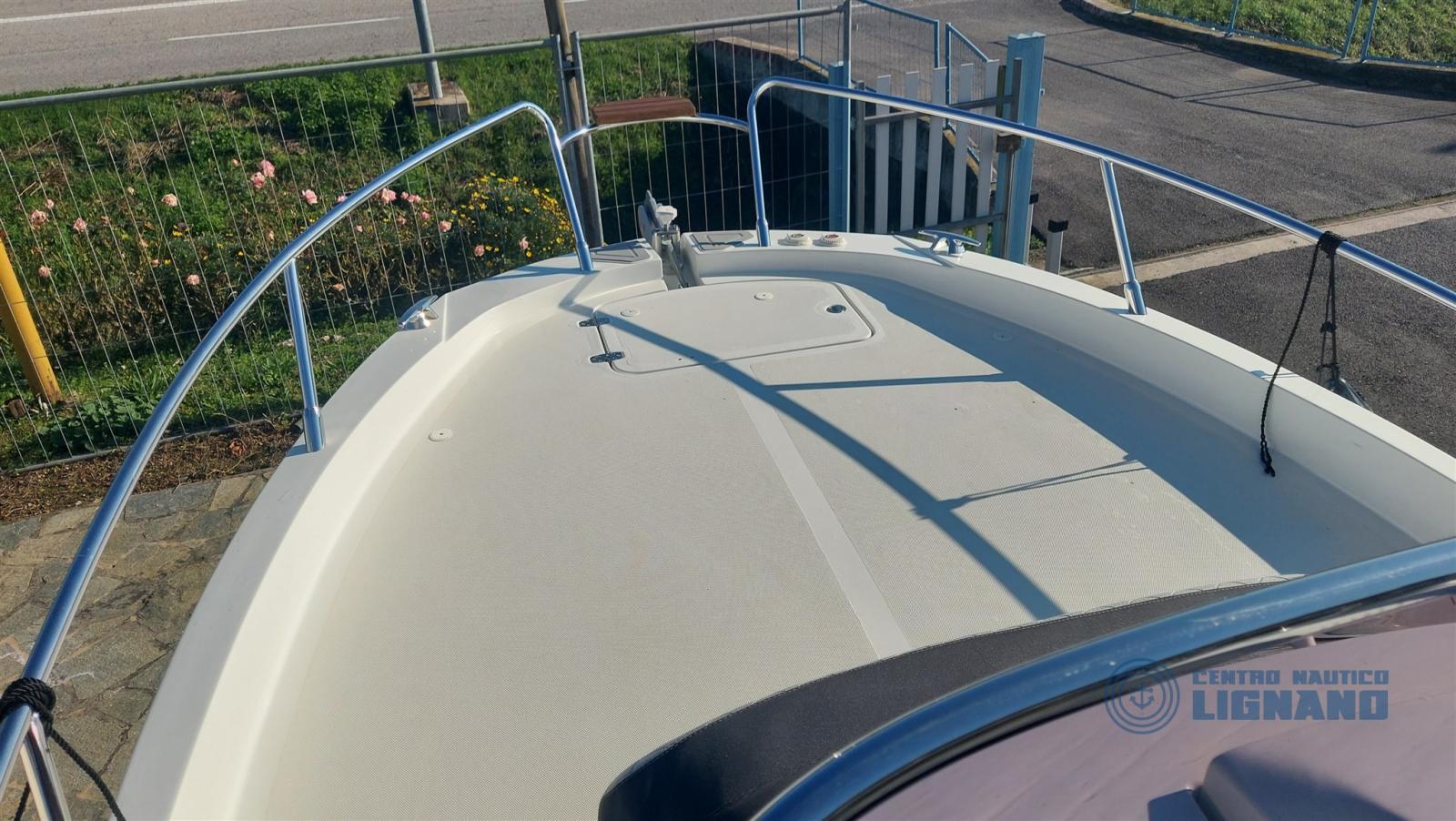 Dotazioni di bordo: mobile speciale in pozzetto con tavolo integrato e frigoriero in acciaio inox con ghiacciaia, GPS Garmin Echomap UHD 7 CV con mappa e trasduttore di poppa, full tek sintetico grigio in tinta con cuscinerie e colore fiancata, impianto elettrico con doppia batteria, impianto doccia con serbatoio, impianto WC marino elettrico, secondo oblò in cabina, verricello elettrico ancora e catena, secondo domando a prua per verricello, tendalino parasole in acciaio inox, tromba, kit teli di copertura ( 3 pezzi ), impianto carburante fisso 82 lt con tappo d'imbarco, 2 prese accendino , serbatoio acqua con impianto doccia, luce in cabina, cuscinerie complete bicolore grigio e perfette, impianto doppia batteria con deviatore, filtro benzina decantatore.