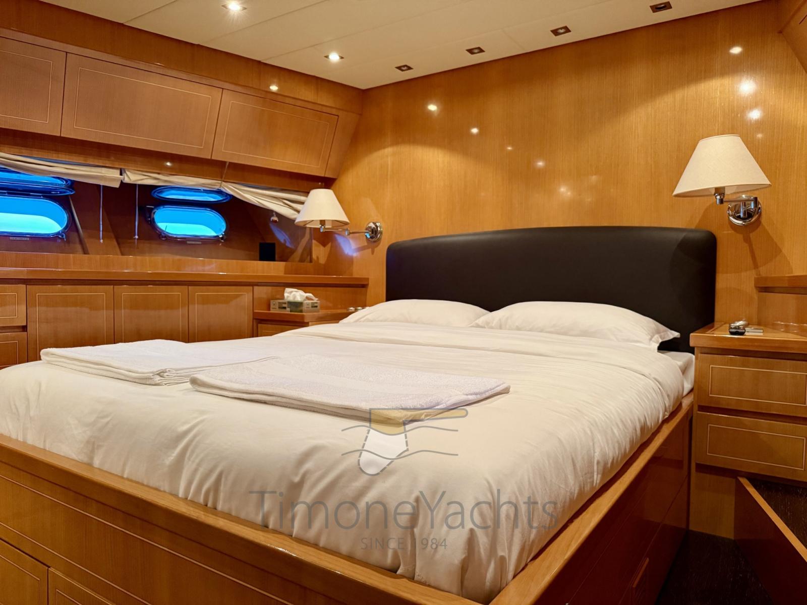 3 ampie cabine ospiti, cabina armatoriale a prua con doppio bagno per lui e per lei, ampio compartimento equipaggio separato con cucina, cabina doppia con bagno privato e accesso diretto alla sala macchine.