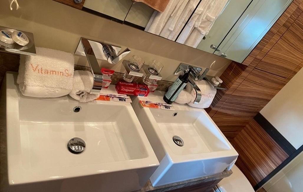 Suite armatoriale a centro nave a tutto baglio, con letto king size, area lounge, TV widescreen e bagno privato | Cabina VIP a prua con letto king size, area lounge, TV widescreen e bagno privato | Cabina ospiti con letto matrimoniale, TV widescreen e bagno privato a dritta, tra la cabina VIP e quella armatoriale | Cabina ospiti con letti in piano, pullman opzionale, TV widescreen e bagno privato a sinistra | Cabina equipaggio con letti in piano e bagno privato con ingresso indipendente dal gavone di prua | Cabina comandante con letto singolo, cabina equipaggio con letti a castello, cucina e lavanderia a centro nave e sala macchine a poppa
