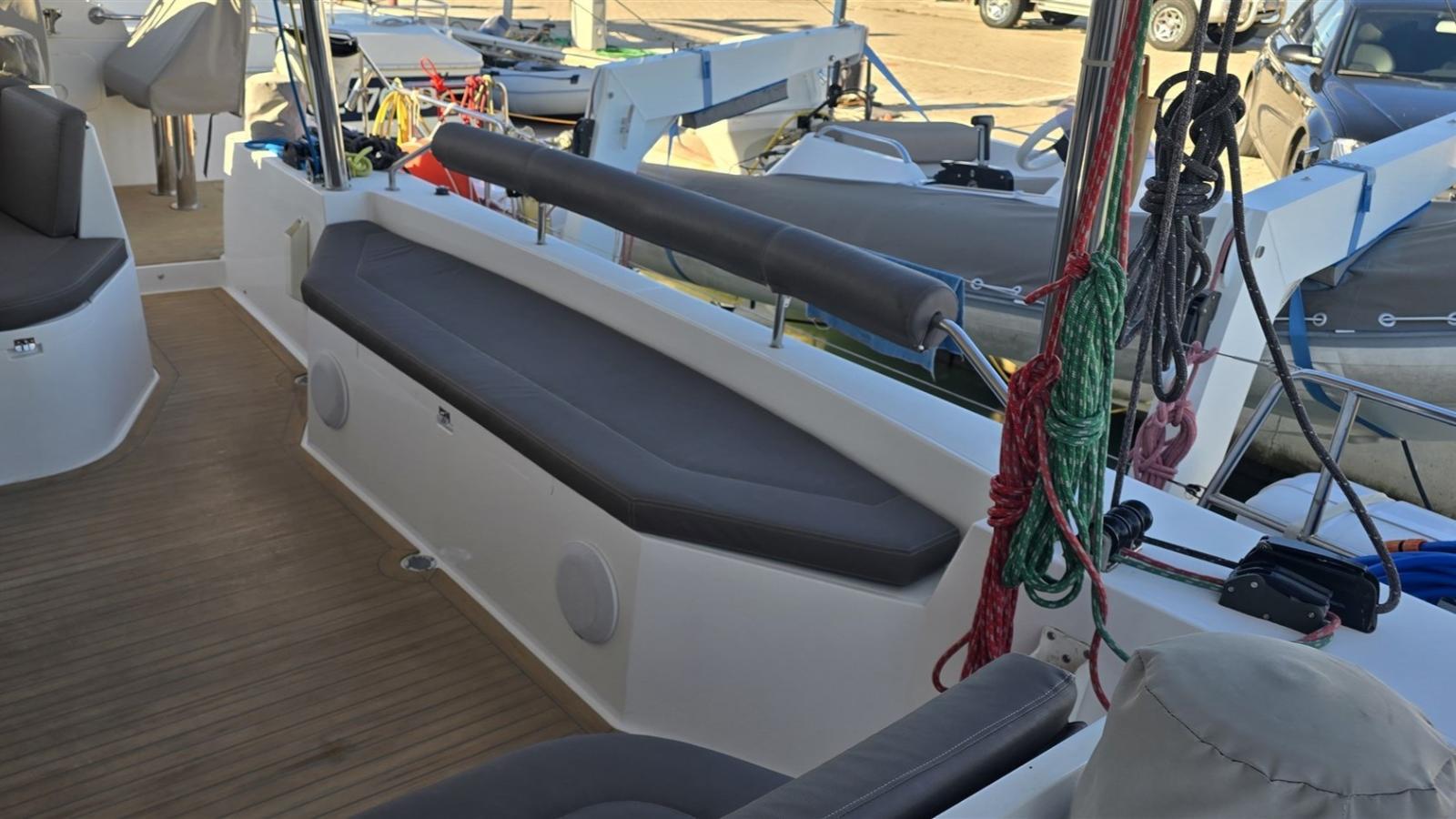 Ancora (FALCON maggiorata con 100 mt. di catena + 60mt. di cima), Altoparlanti (interni/esterni), Aria condizionata (caldo/freddo), Autoclave, Batterie (servizi VICTRON AGM 6x165ah - motori NAUTICA IB AGM 2x120ah (2025) - generatore 100ah), Boiler, Bompresso, Caricabatterie (MASTERVOLT 100A), Clima reversibile, Contametri catena (QUICK sulla timoneria sx), Copripozzetto (invernale/estivo), Cuscineria completa, Dissalatore (DESSALATOR 260 L/h - 220V), Elica di prua - Bow Thruster (MAX POWER 15kW), Fiocco steccato autovirante (2024), Generatore (ONAN 9.5 kW), Gruette per tender, Impianto acque nere, Impianto stIBereo (FUSION), Impianto TV, Inverter (VICTRON 3KW), Jennaker con frullo, Lazy bag, Lazy jack, Luci sottoscafo, Oscuranti, Pannelli solari, Passerella (2024), Pompe di sentina automatiche, Pozzetto in Teak (sintetico) Prese interne 12v, Prese interne 220v, Sartiame spiroidale, Salpa ancore elettrico (QUICK), Serbatoio Acque Nere, Tavolo dinette abbattibile, Tavolo pozzetto, Telecamere (4), Teli copriconsolle, Teli copri finestre, Teli coprisedute, Tender SUR MARINE 3,70m - Motore SUZUKI 30HP (con copertura tubolari e copertura totale 2024 / Batteria 2024 / Impianto elettrico 2025), Tetto elettrico, TV a scomparsa (in dinette), WC marini elettrici (4), WC marino manuale (1), Winch (2) LEWMAR, Winch elettrici (2) LEWMAR, Winch tonneggio di prua, Zanzariere, Zattere (ARIMAR 2 x 8p)