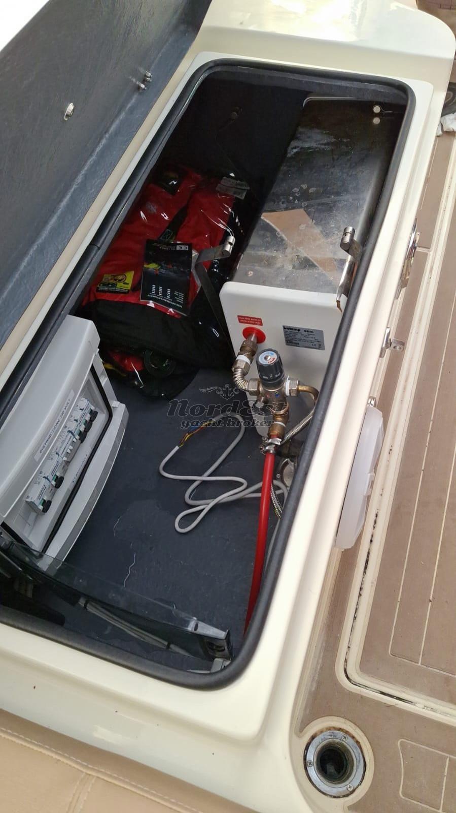 Tensione di bordo: 12 / 220 V - Caricabatterie - Autoclave - Boiler - Dissalatore - Elica di prua - Doccia esterna - Luci di cortesia - Plancetta - Impianto acque nere - Frigorifero esterno - Frigorifero - Cuscineria prendisole - Norvegese