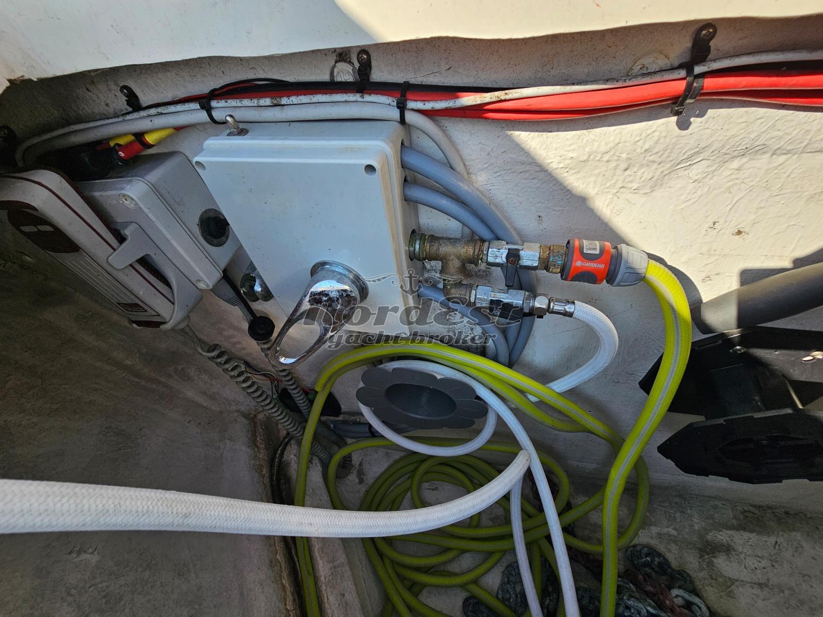 Generatore - Tensione di bordo: 12 / 220 V - Caricabatterie - Autoclave - Boiler - Impianto antincendio - Elica di prua - Doccia esterna - Flaps - Passerella - Luci di cortesia - Aria condizionata - Impianto acque nere - Frigorifero esterno - Lavatrice - Forno - Frigorifero - Piano cottura: Induzione - Cuscineria prendisole - Norvegese