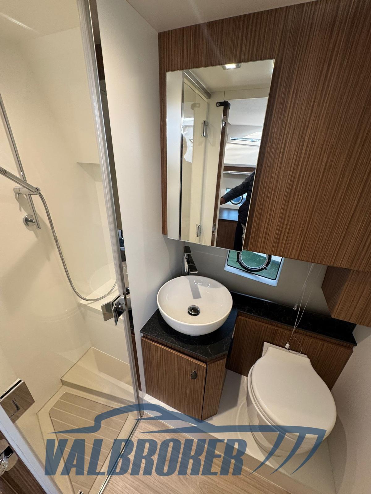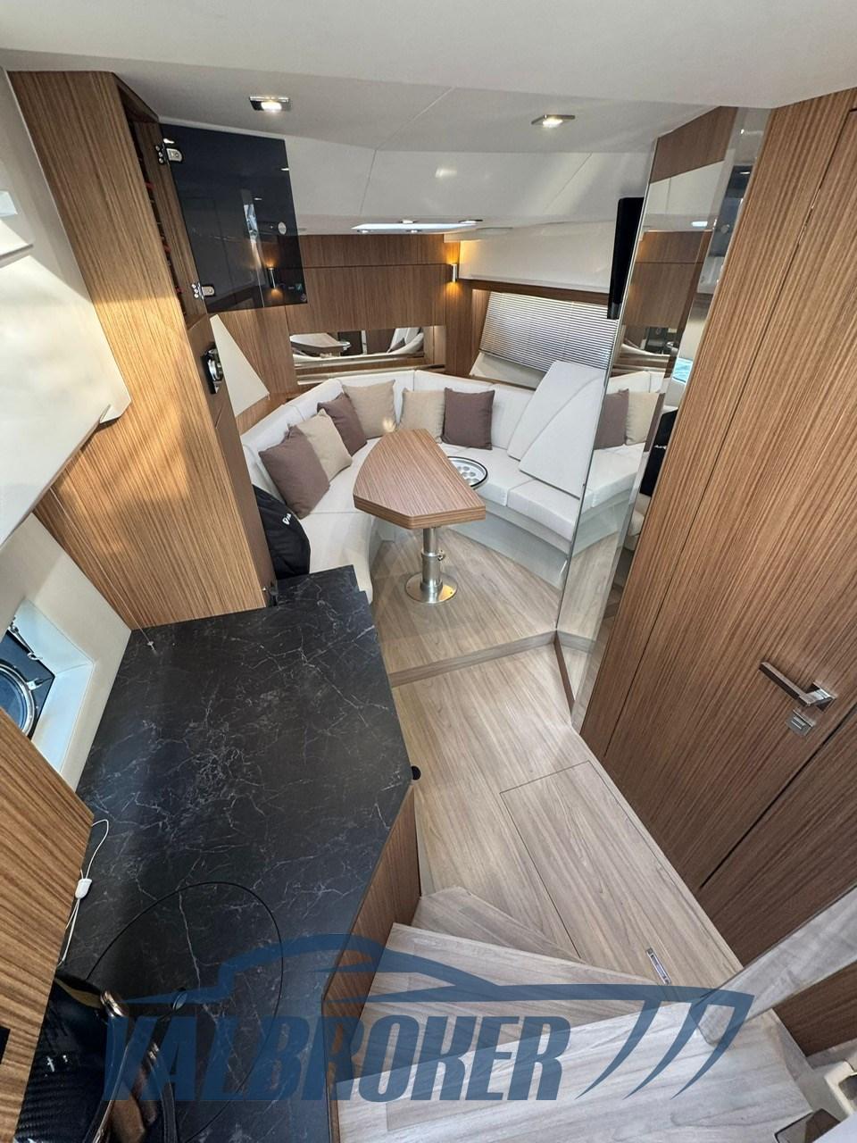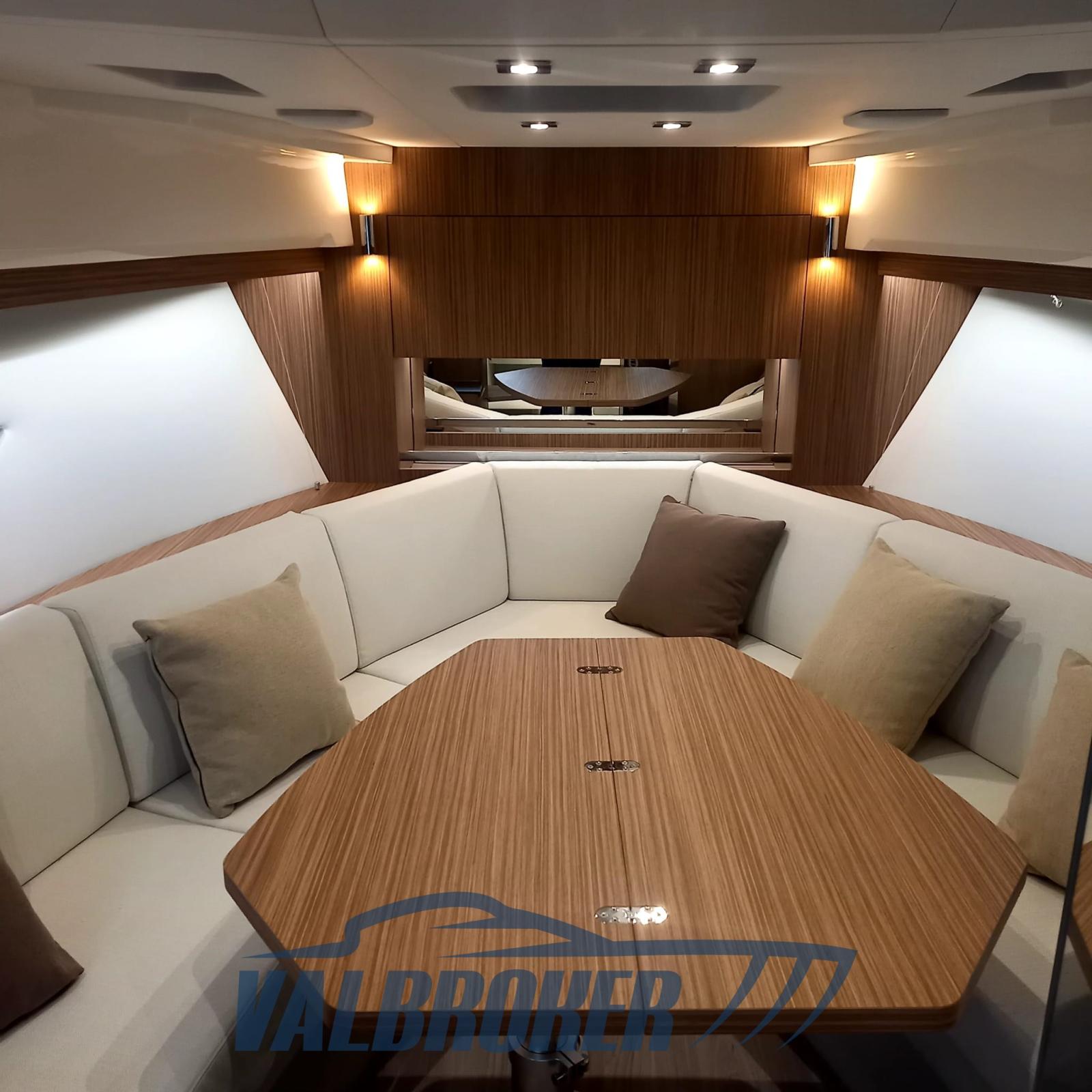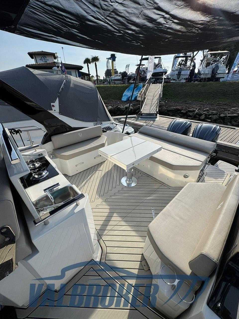 Cruscotto con effetto in carbonio, correttori di assetto Zipwake Dynamic Trim System, predisposizione generatore, passauomo apribile a prua, chiusura parabrezza su 3 lati, telo copri cuscineria, kit cuscini per trasformazione dinette prua e poppa