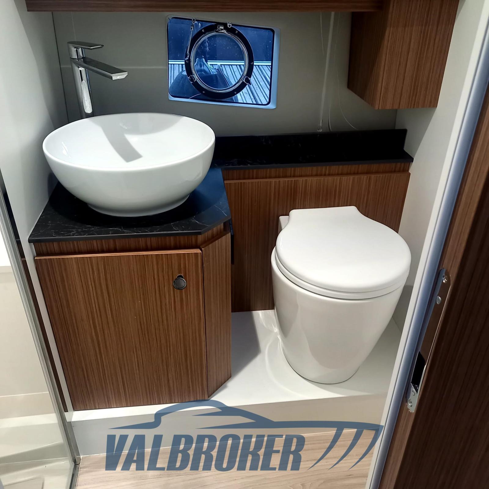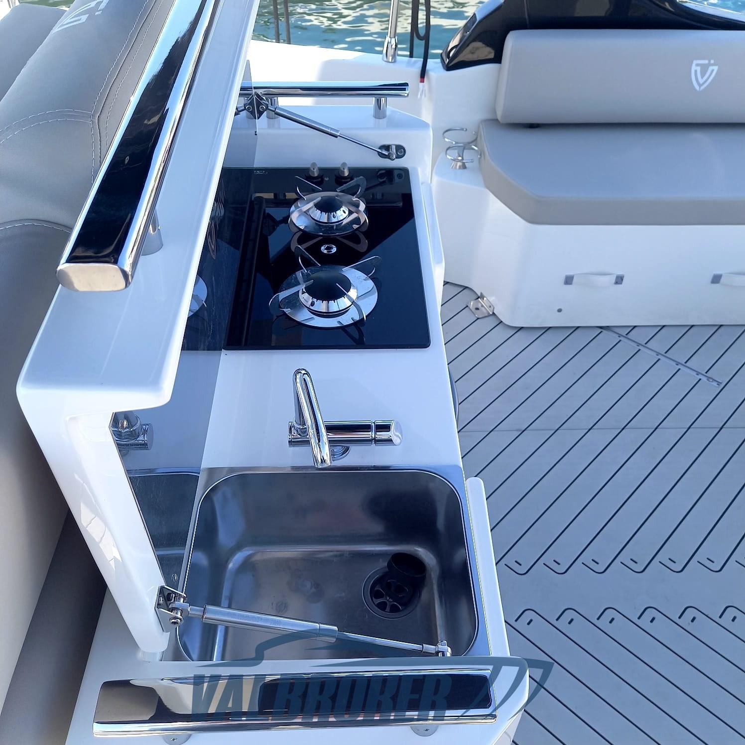 NATANTE NON TARGATO. FULL OPTIONAL: Joystick di manovra Yamaha, elica di prua, aria condizionata caldo/freddo 7000 BTU, autopilota, prendisole di poppa XL con guide scorrevoli e schienale ribaltabile, cucina esterna, T-TOP nero lucido.Seadeck grigio con fughe nere in pozzetto e camminamenti laterali. Non scotta e non ha bisogno di manutenzione.