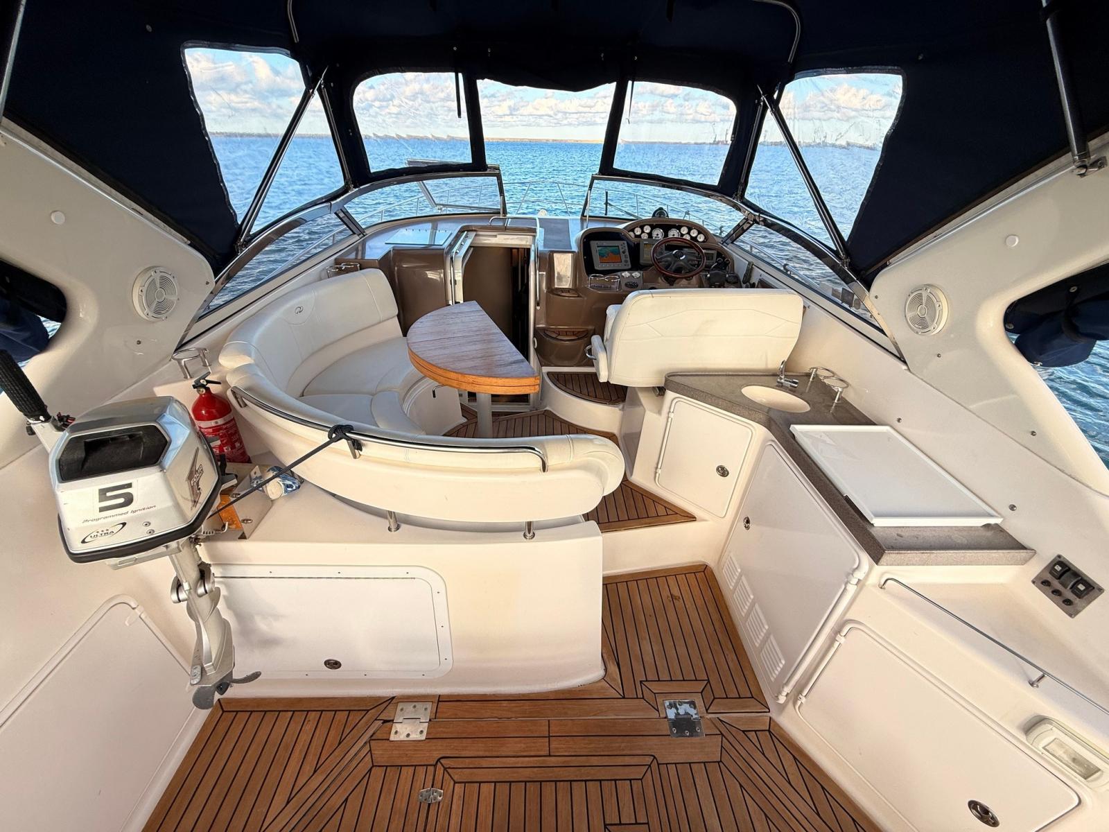 All’esterno, pozzetto spazioso con grande divano a U, tavolo centrale, frigorifero, fornello e prendisole di poppa; ideale per la vita all’aperto e la crociera costiera.